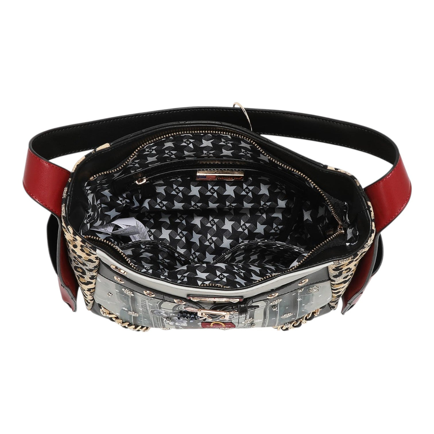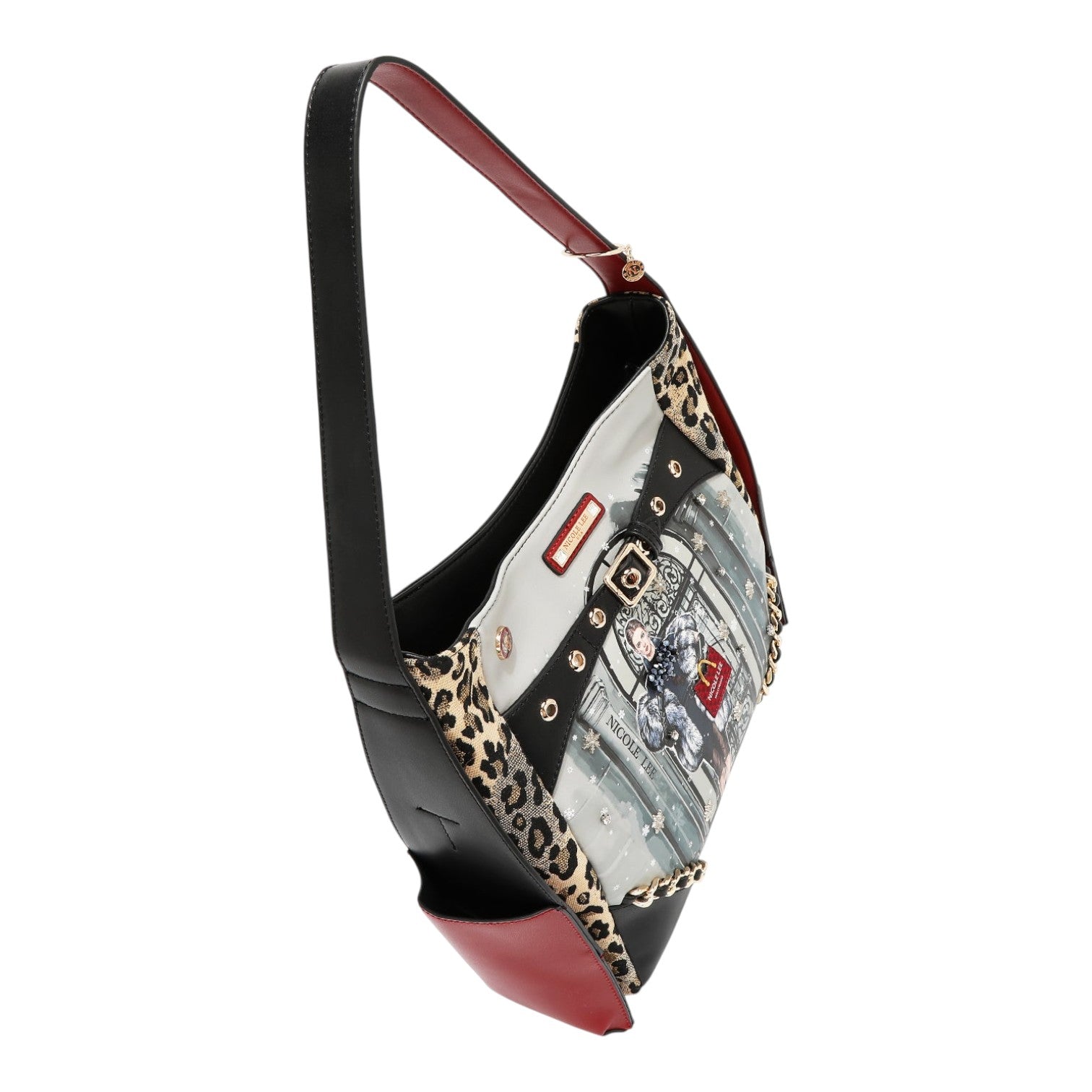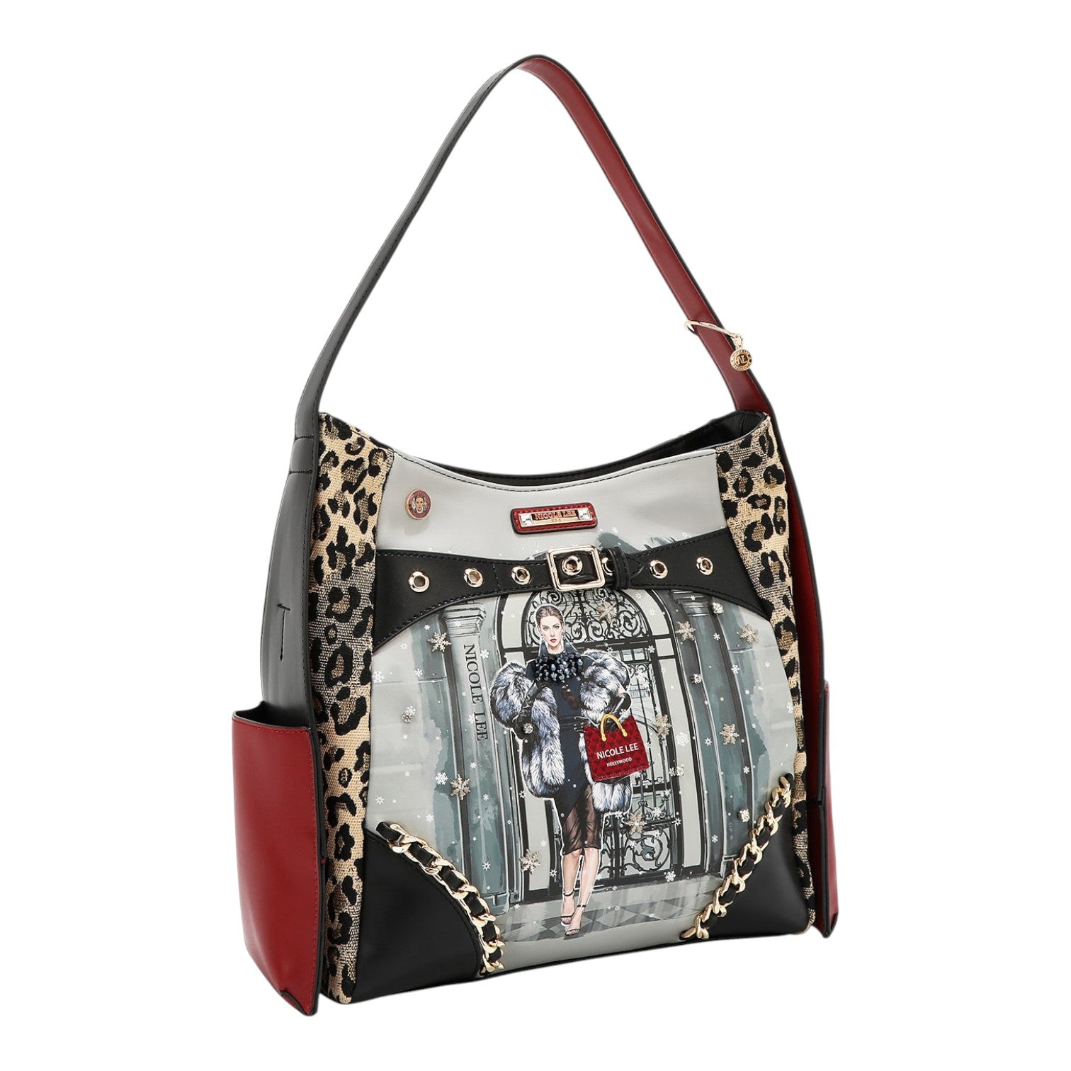 Bolso hobo Nicole Lee de la nueva colección Moda SnowFlake con asa para llevar al hombro, detalles laterales en animal print, cinturón en la parte frontal, apliques de pedrería y cadenas y estampado Nicole Lee ideal.