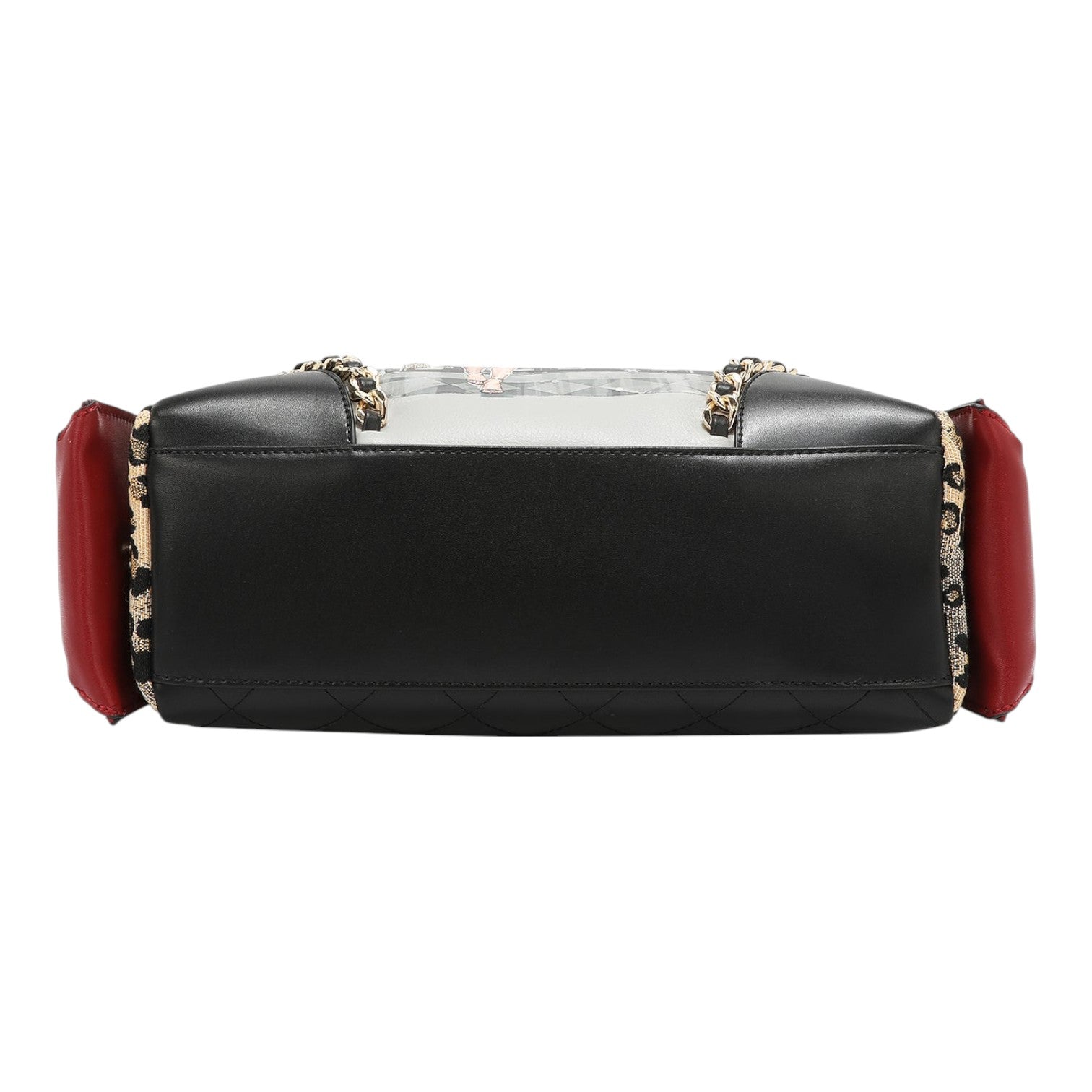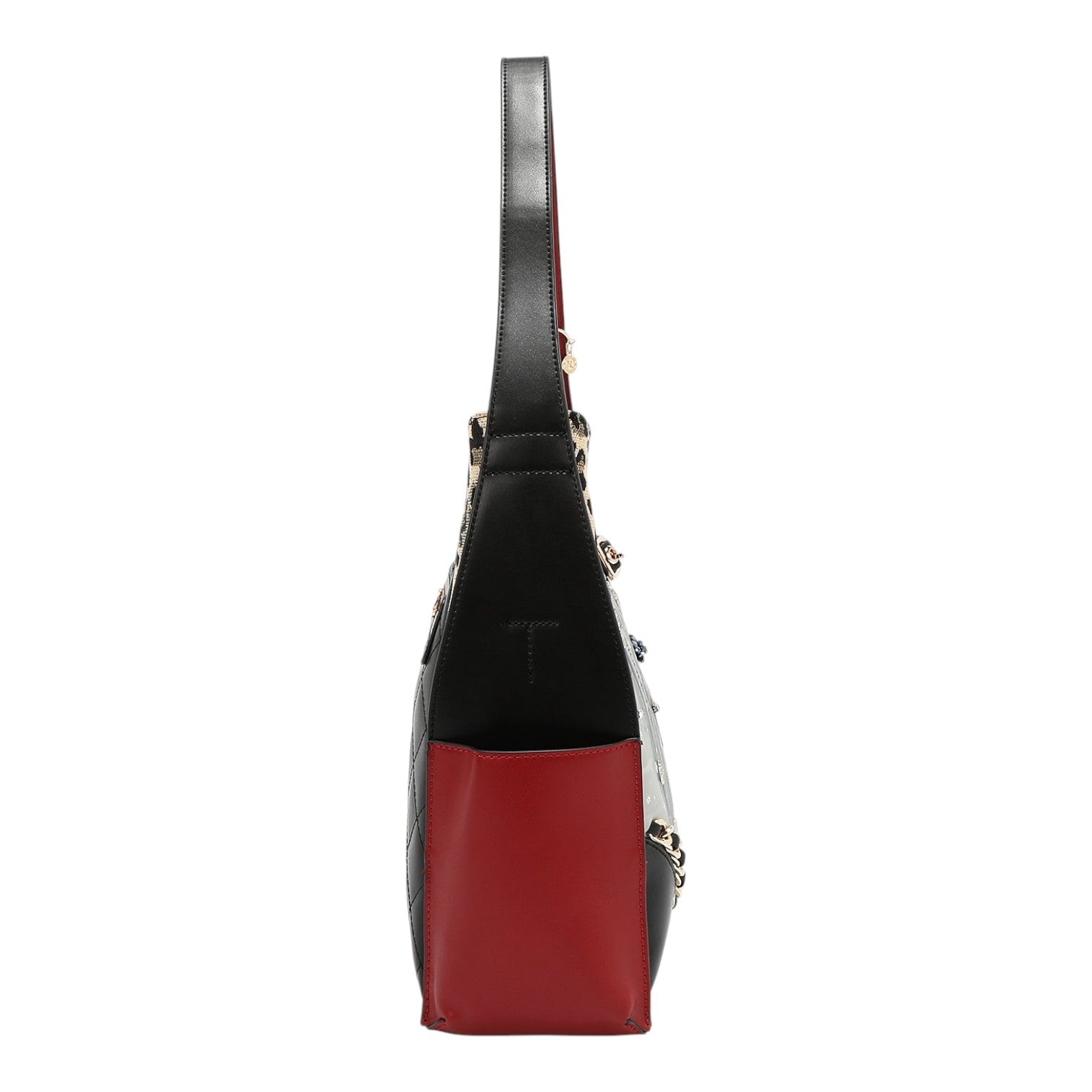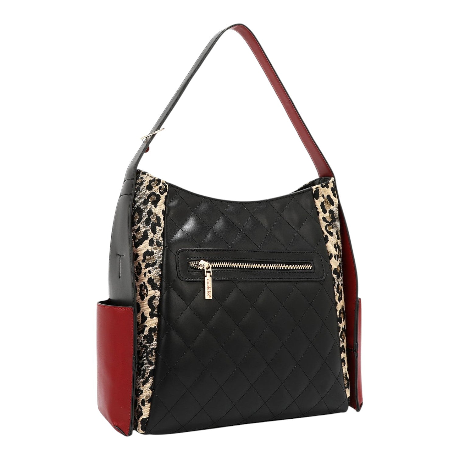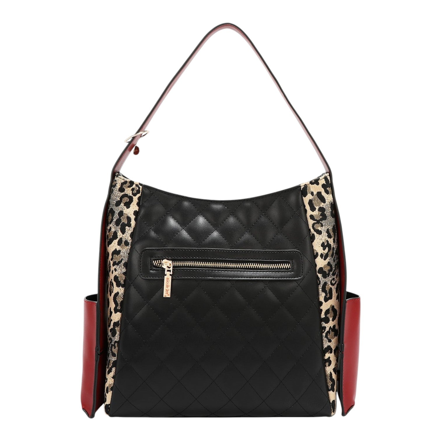 Bolso hobo Nicole Lee de la nueva colección Moda SnowFlake con asa para llevar al hombro, detalles laterales en animal print, cinturón en la parte frontal, apliques de pedrería y cadenas y estampado Nicole Lee ideal.