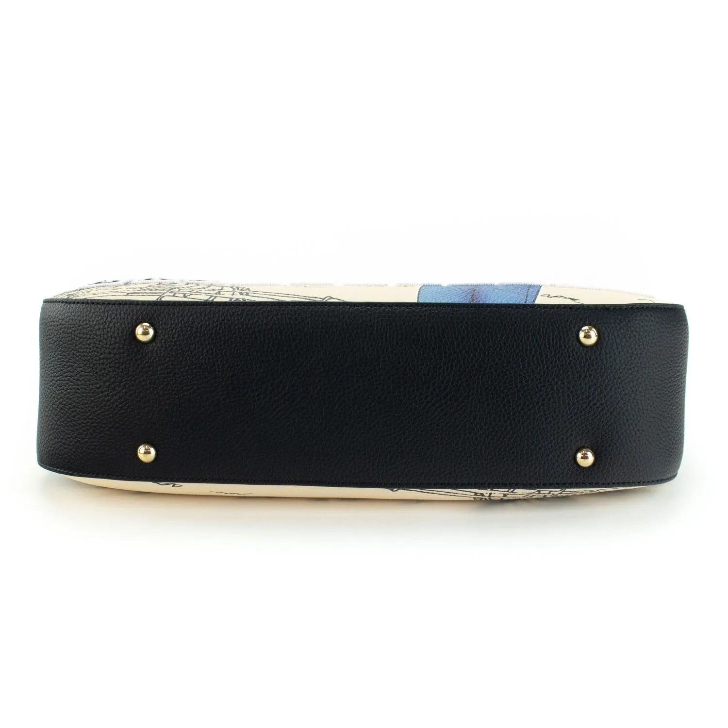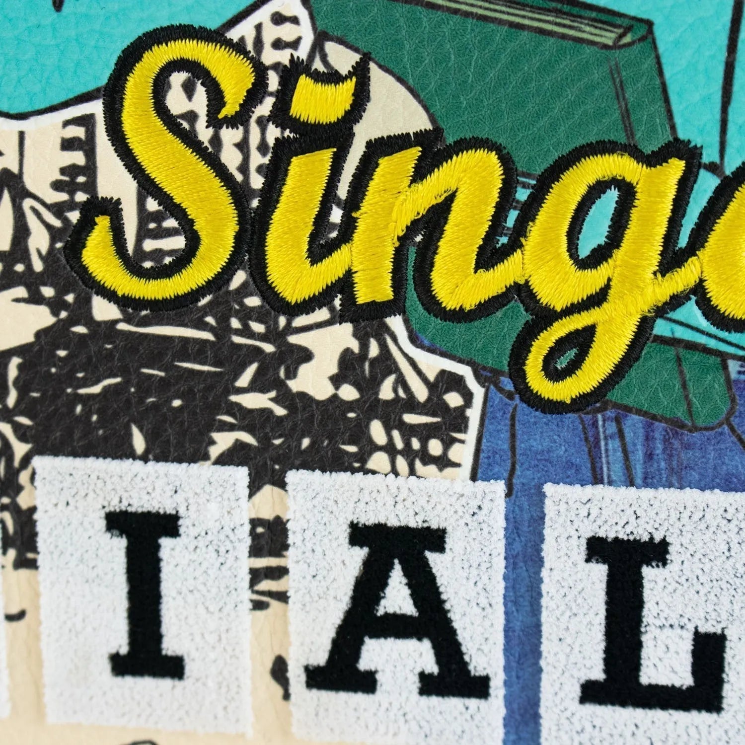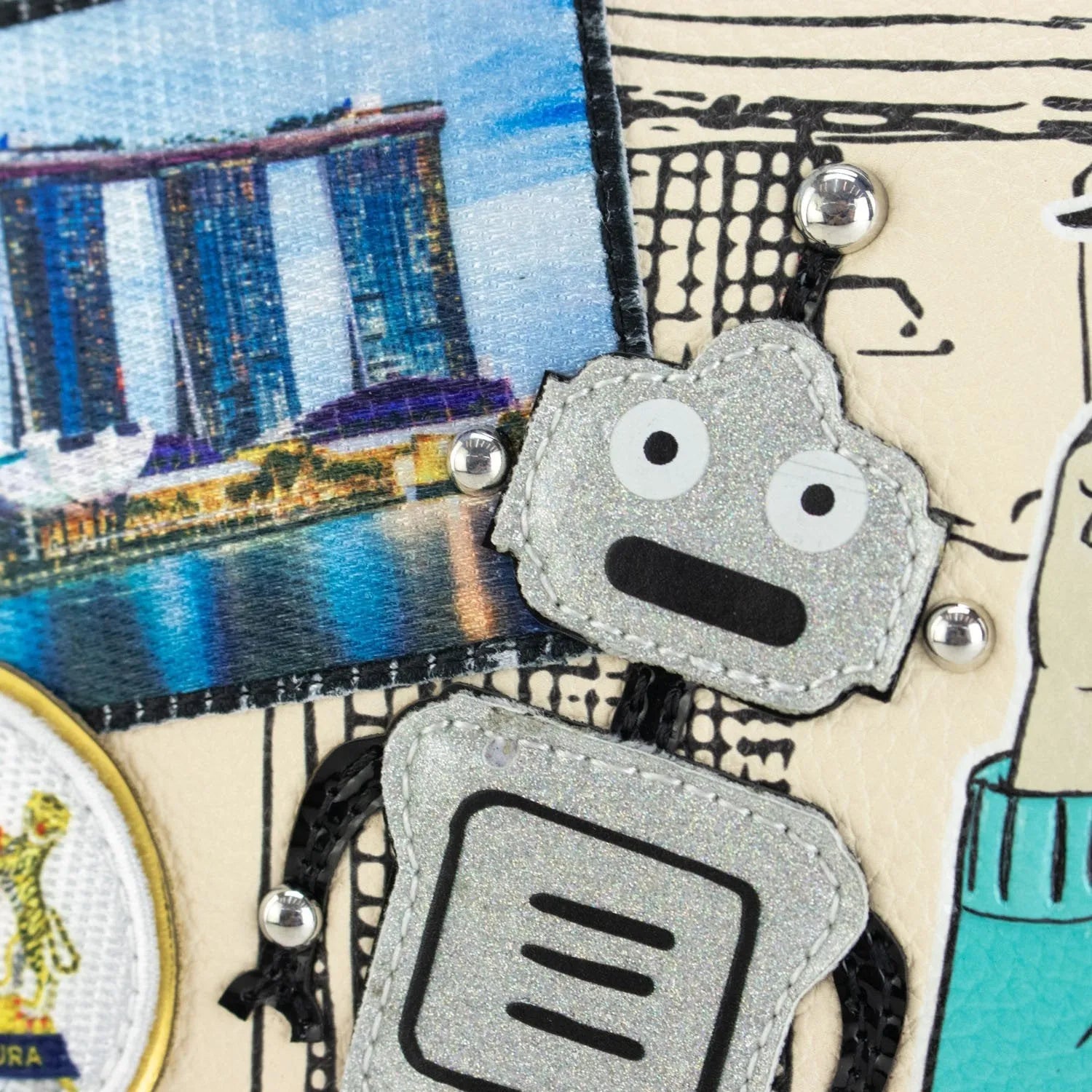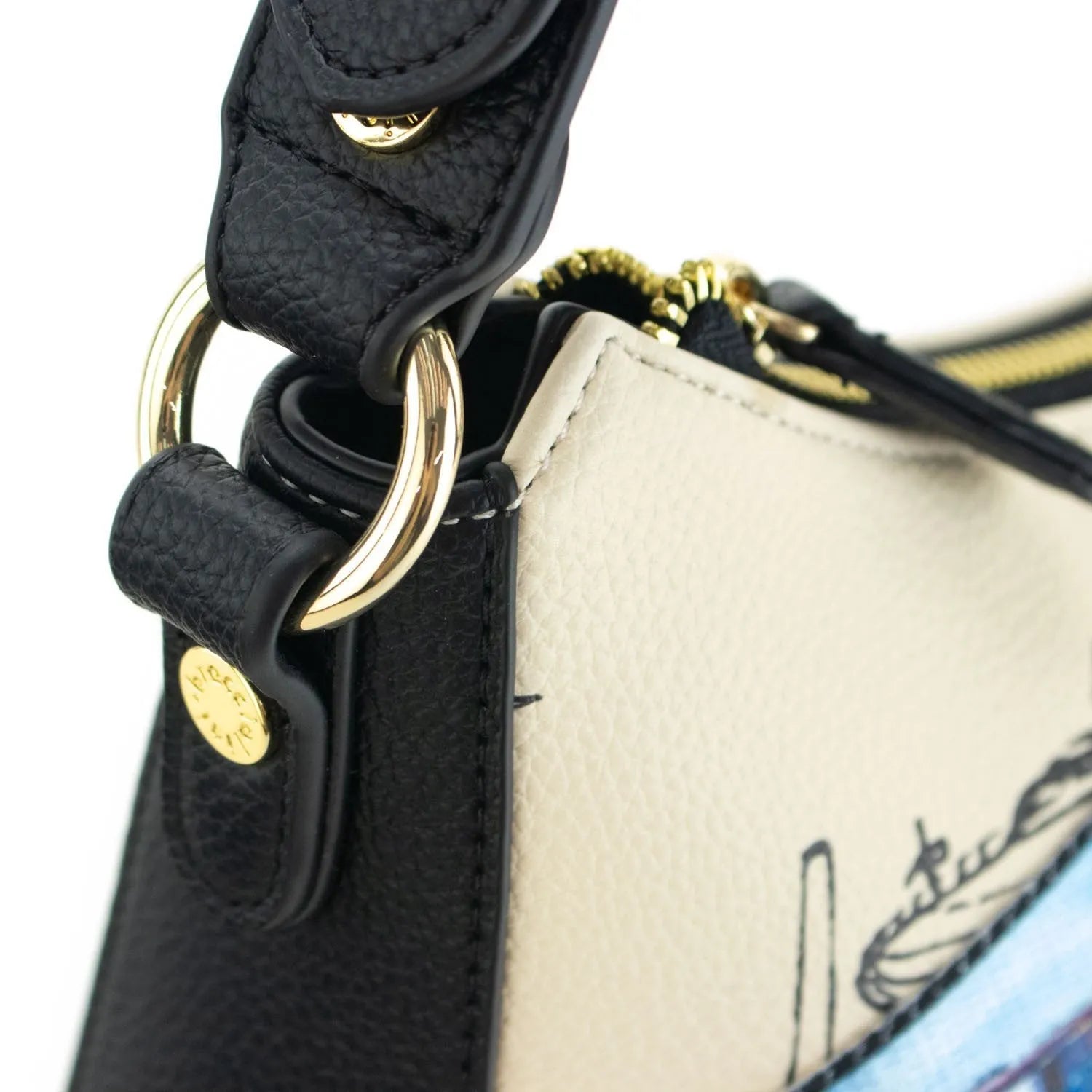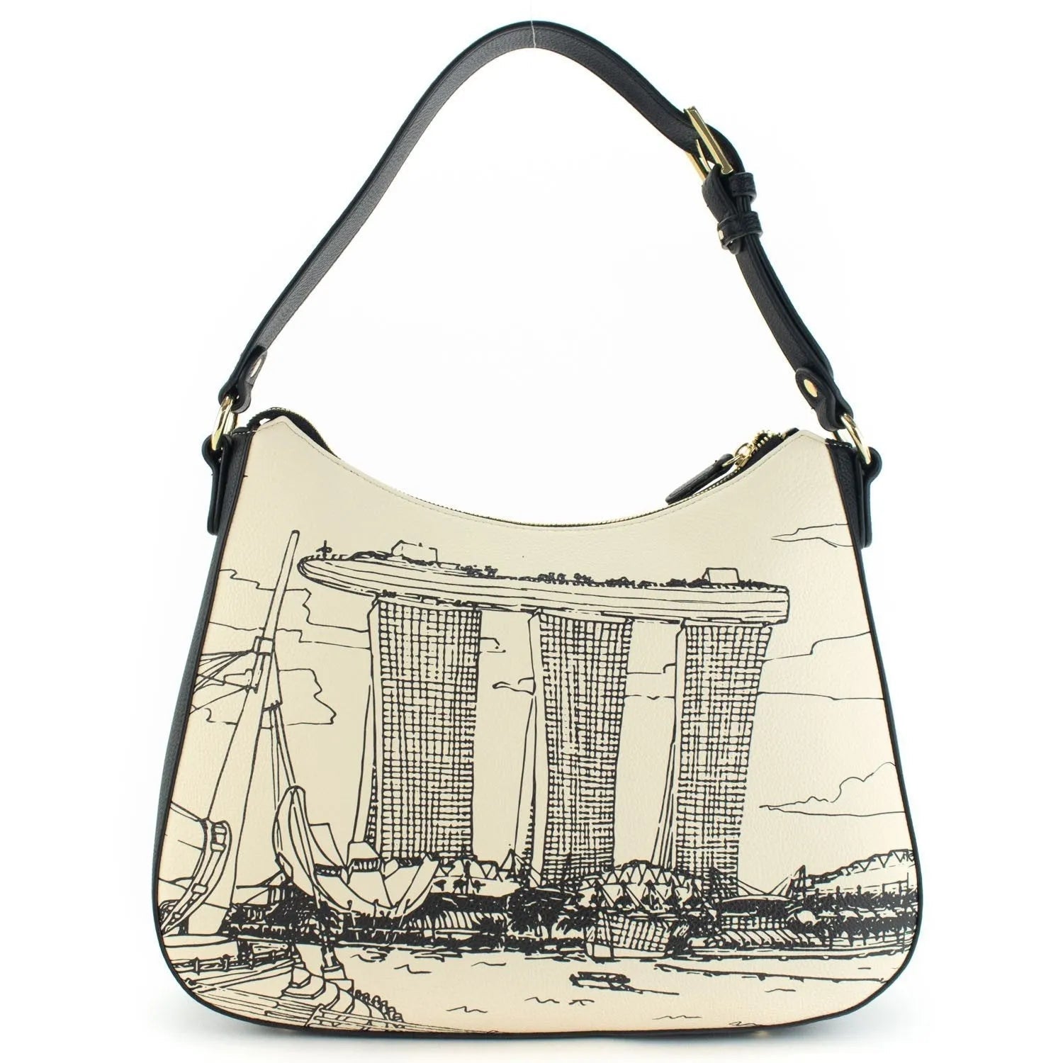 A gondola-style bag with a shoulder strap and a large interior compartment with zipper closure. It incorporates protective studs on the floor in gold tone. Its exterior is a spectacle of color that details the characteristic elements of the city of Singapore with appliqués, embroidery, and diamonds that enhance the design to the highest level. You will love it!