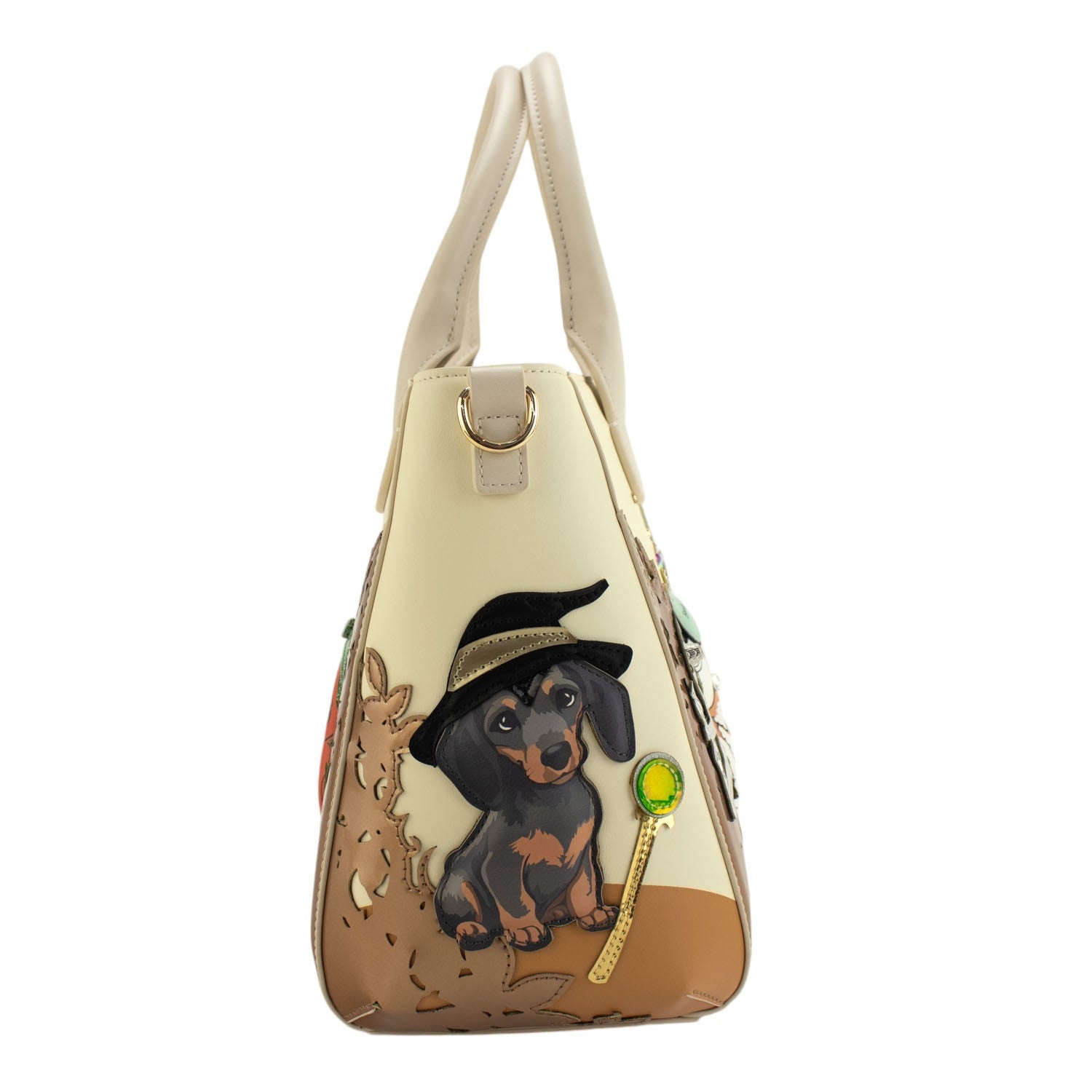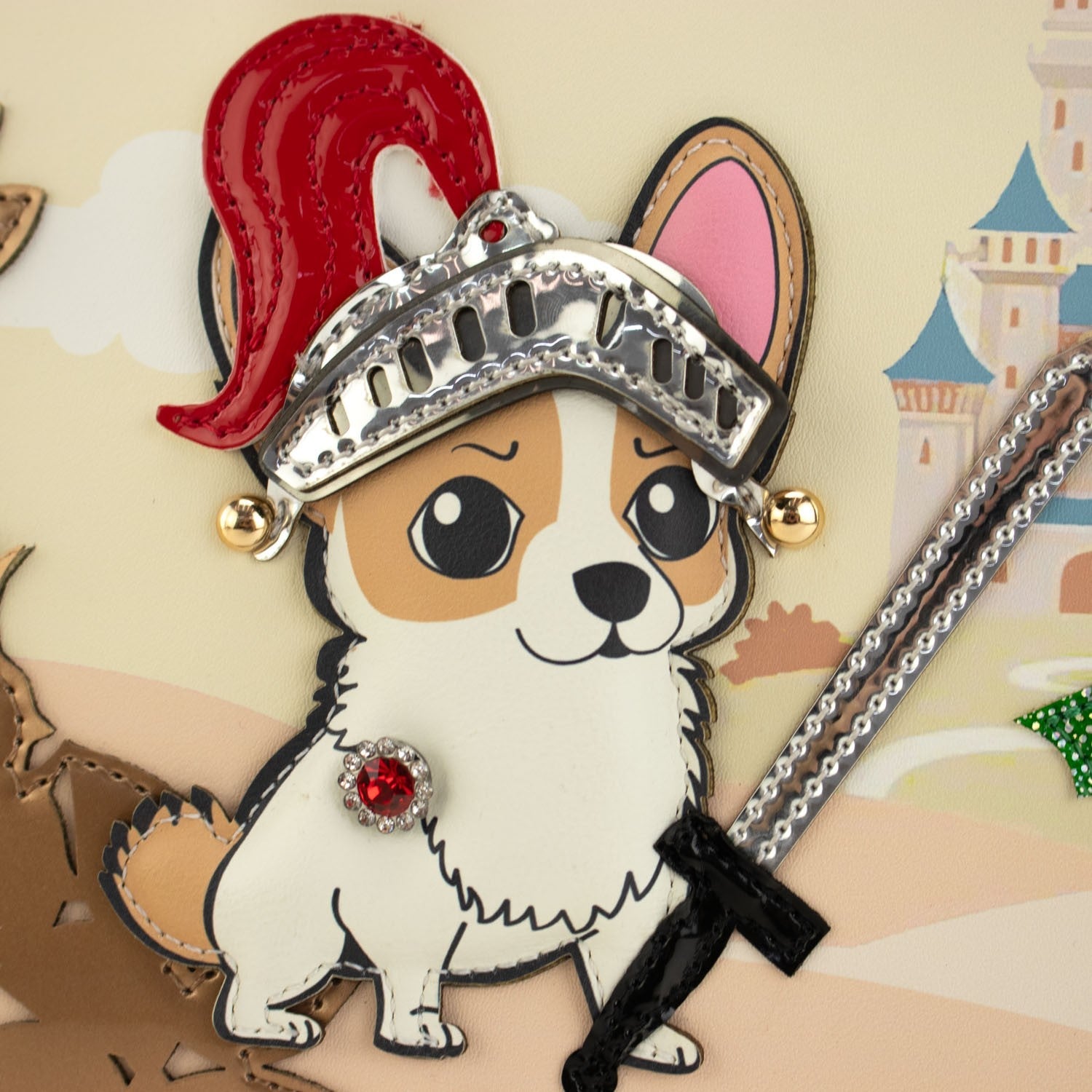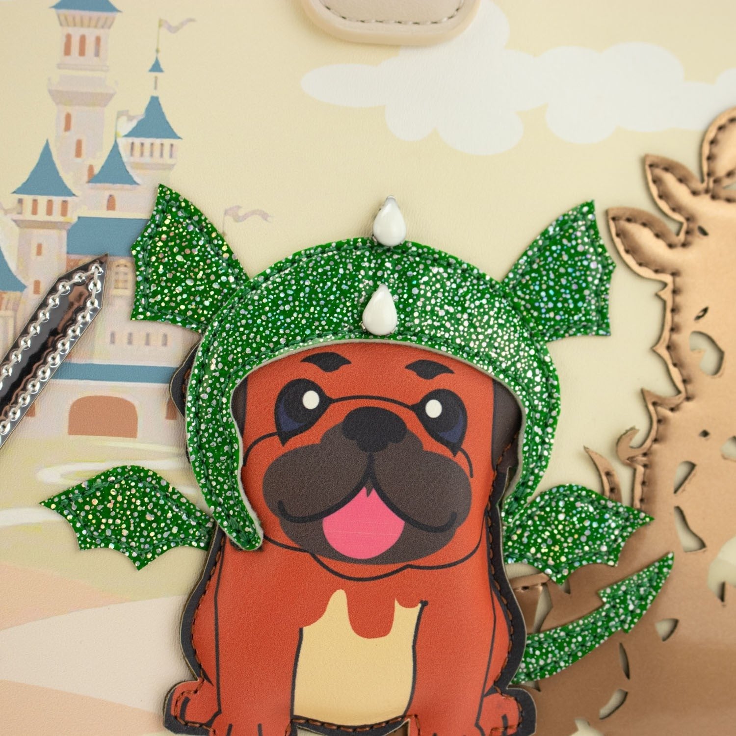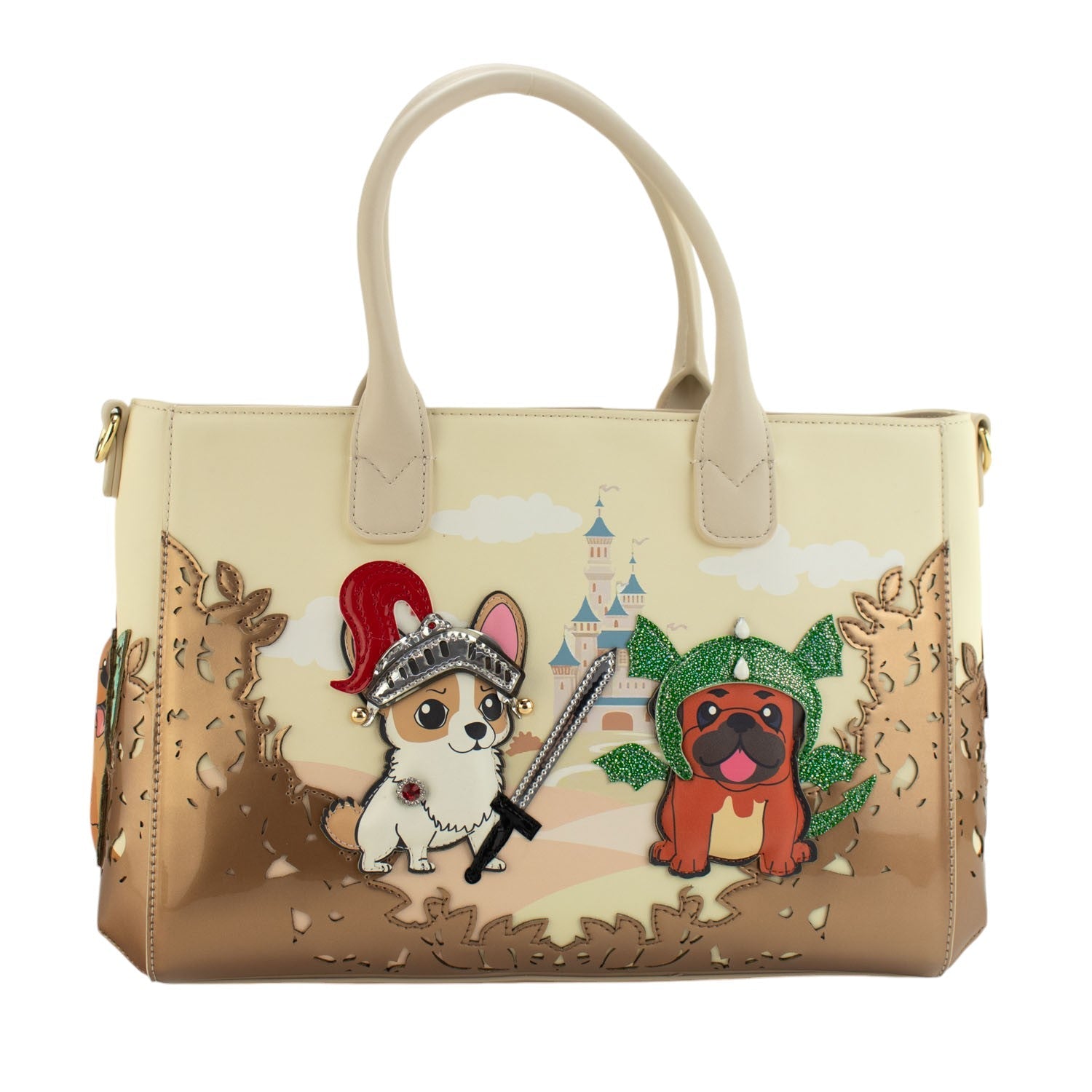 Un bolso de mano con doble asa de mano y un compartimento interior amplio con separación, con cierre de cremallera. Su exterior es un espectáculo de color inspirado en el cuento de la Bella durmiente con apliques y brillantes que realzan el diseño al máximo nivel ¡Te enamorará nada más verlo!