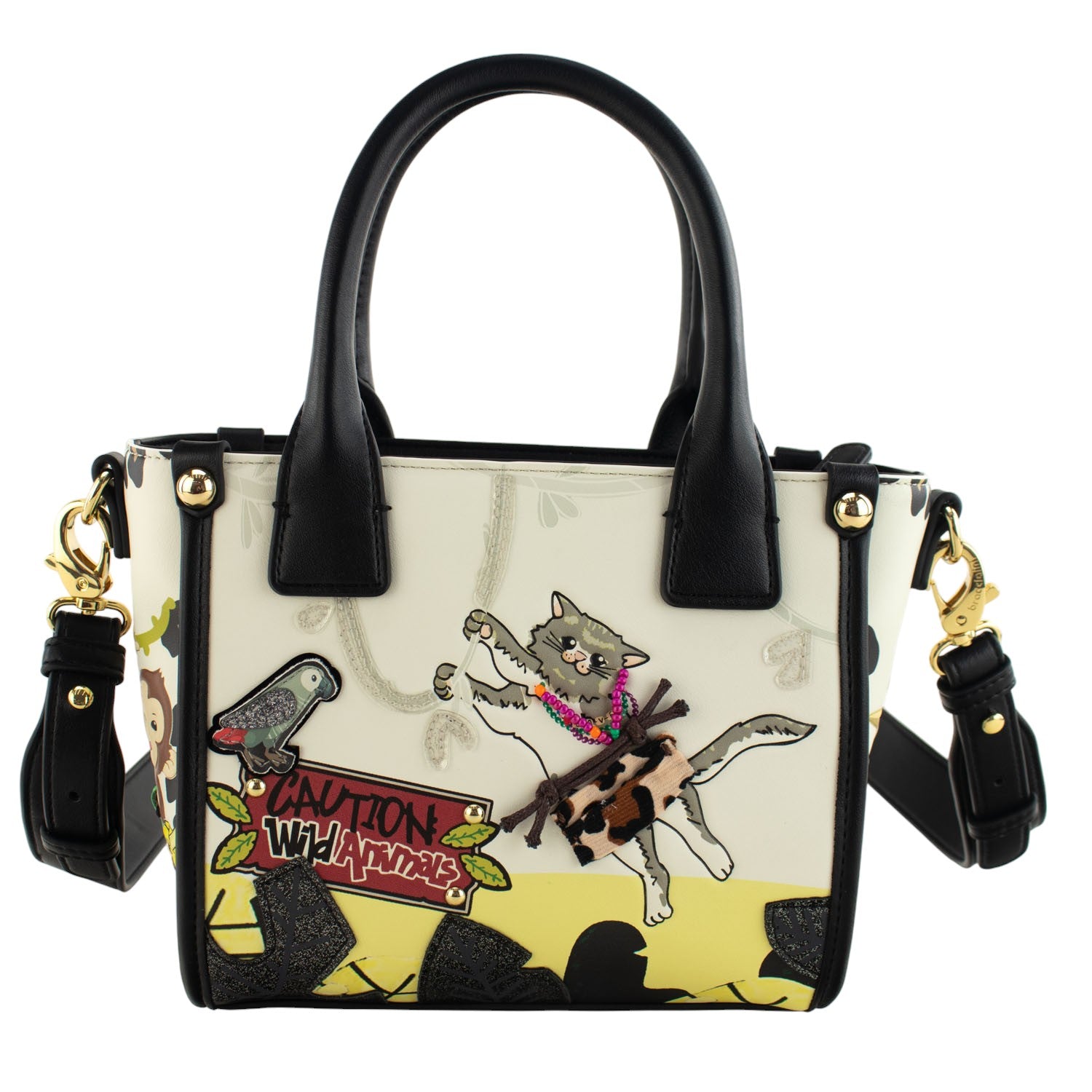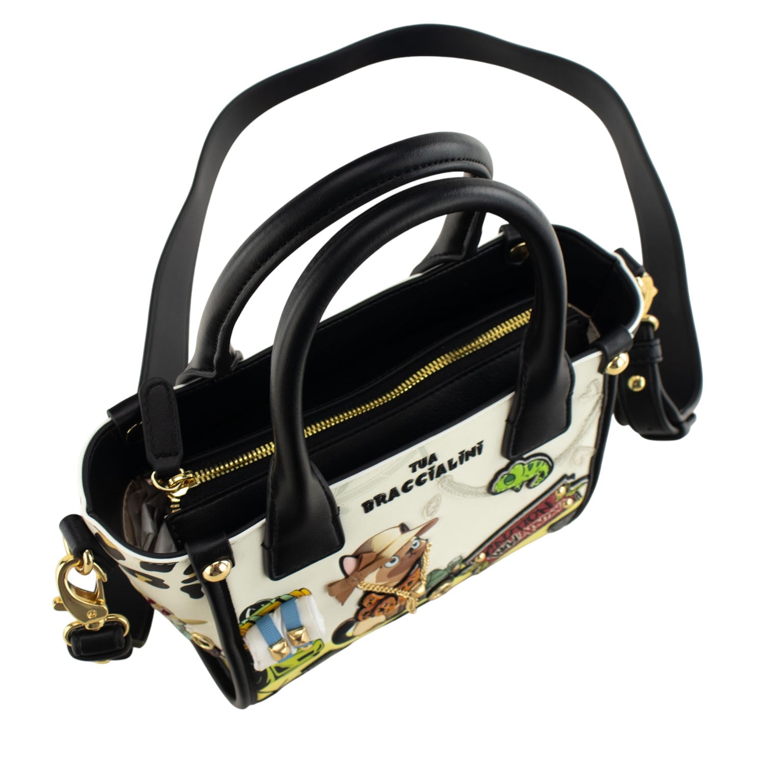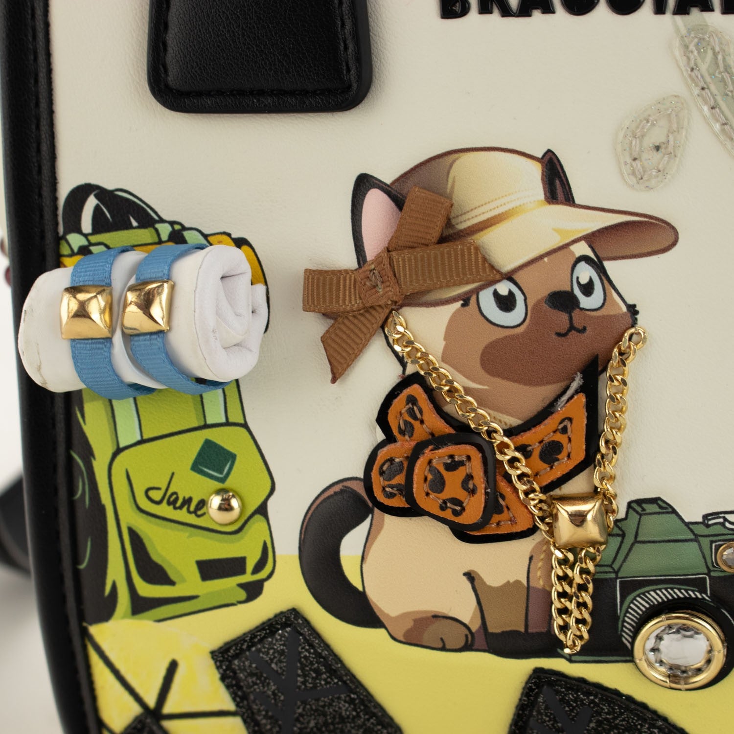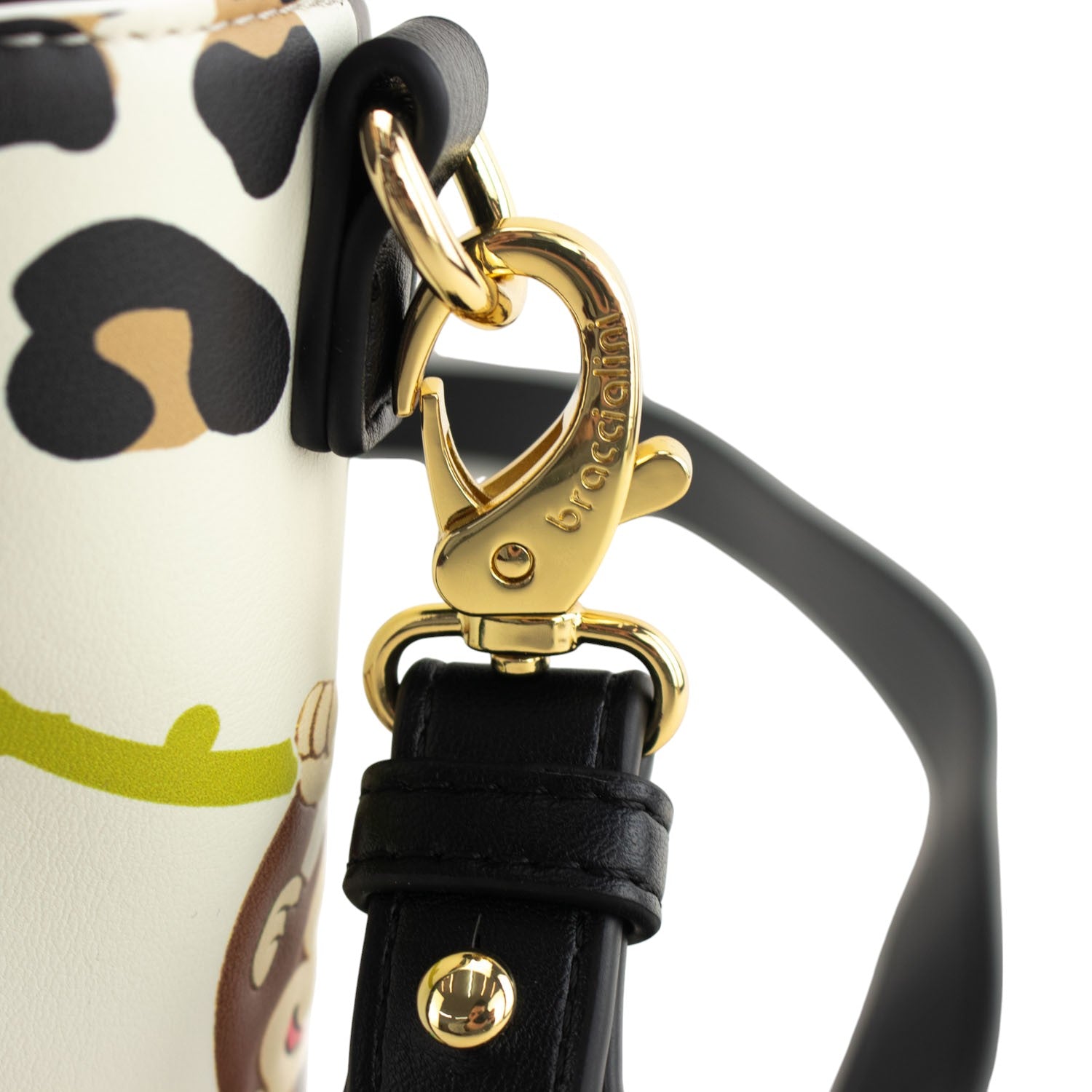 Braccialini nos sorprende con una nueva Colección super original con representación de aventuras. En este modelo de Bolso de mano Braccialini Allround Safari podrás ver representado un escenario en un safari. Este bolso pequeño con doble asa de mano y cinta para llevar al hombro tiene cierre de cremallera y está repleto de detalles.