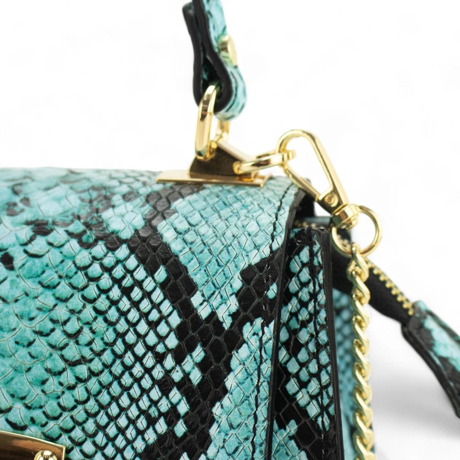 Un bolso muy original para lucir a diario, realizado en Piel 100% genuina vacuno italiana, este bolso está hecho en Italia con una excelente manufactura y calidad, tiene un cierre broche metalizado en tono dorado muy original, con cierre de solapa y cremallera interior, con una preciosa asa de mano y cinta de cadena en tono dorado.