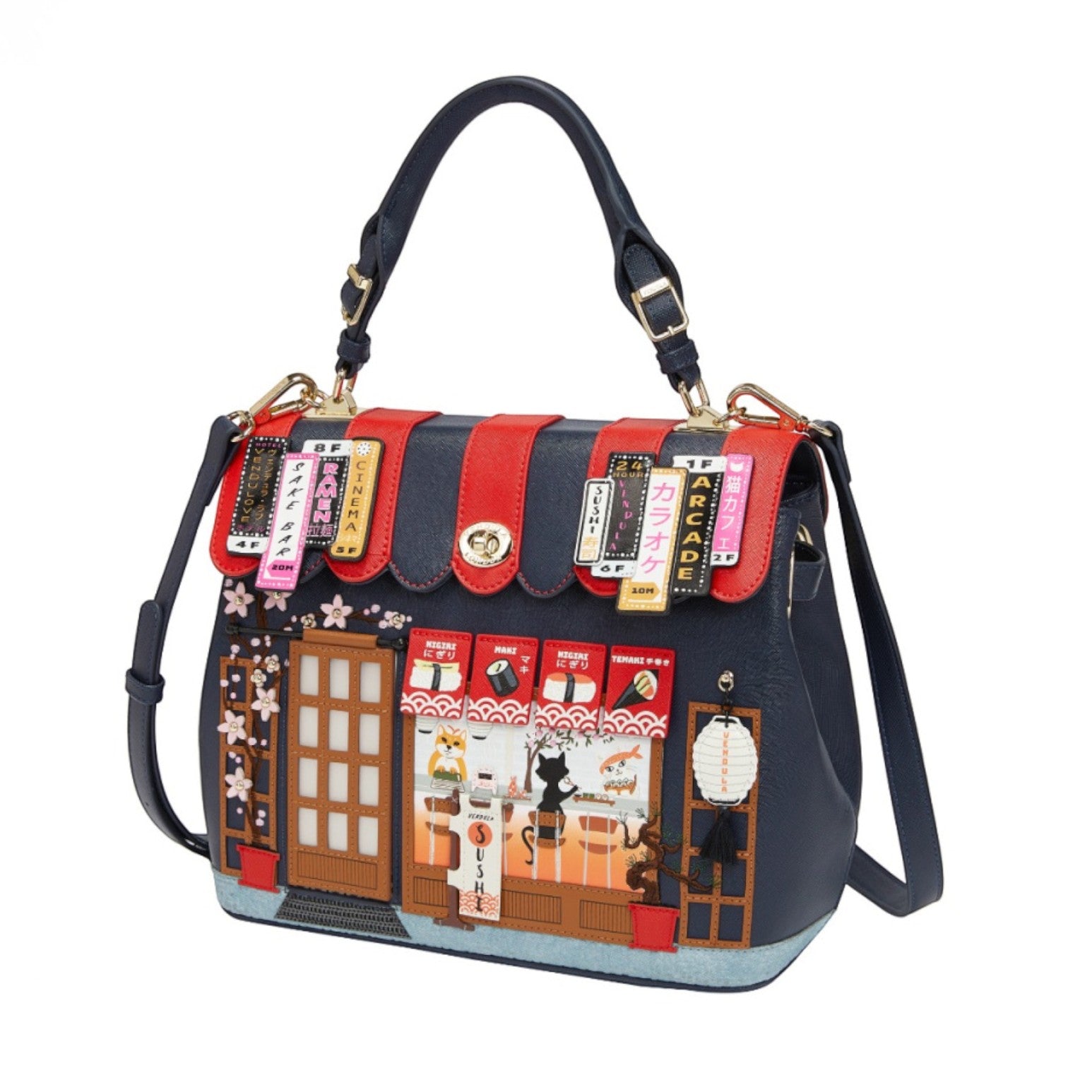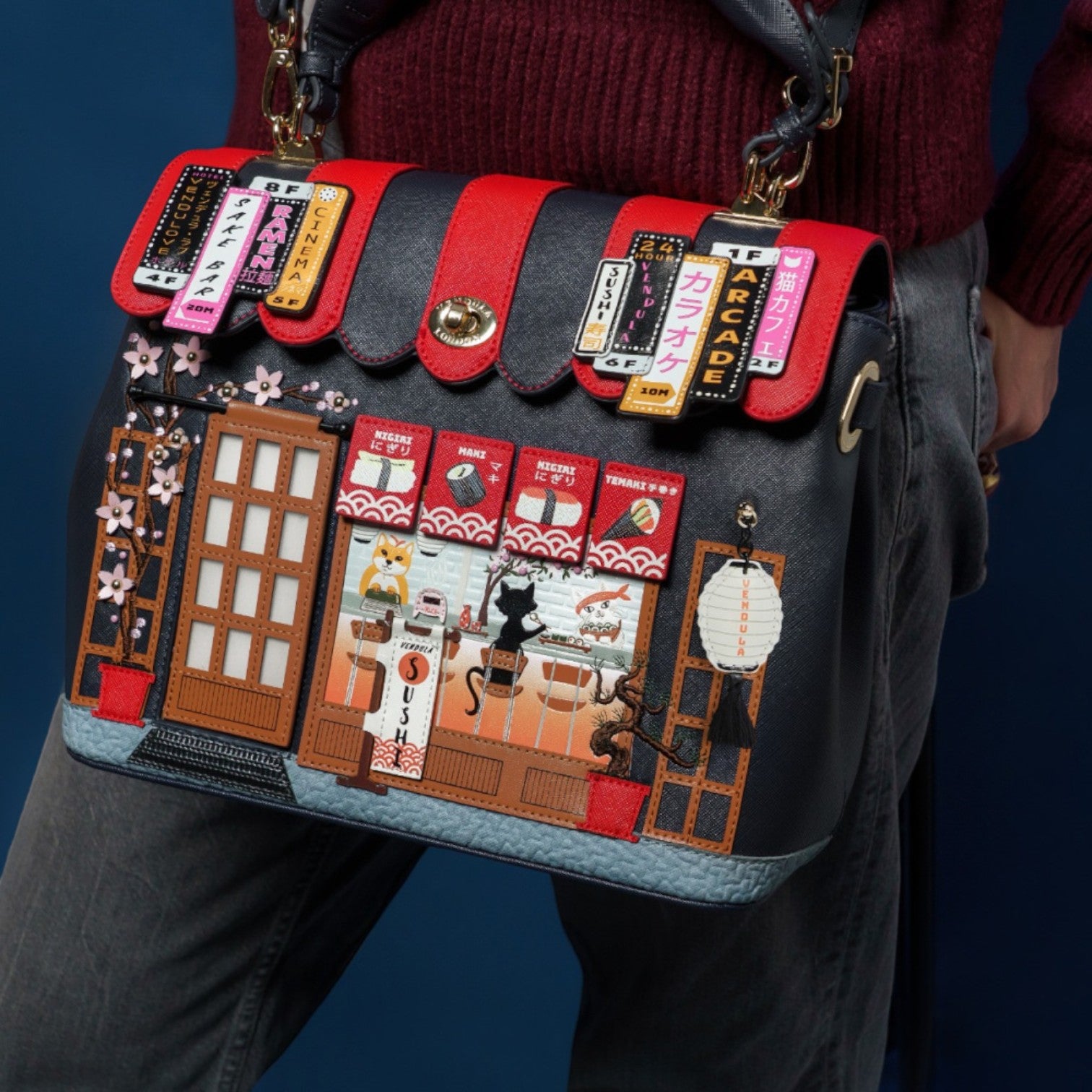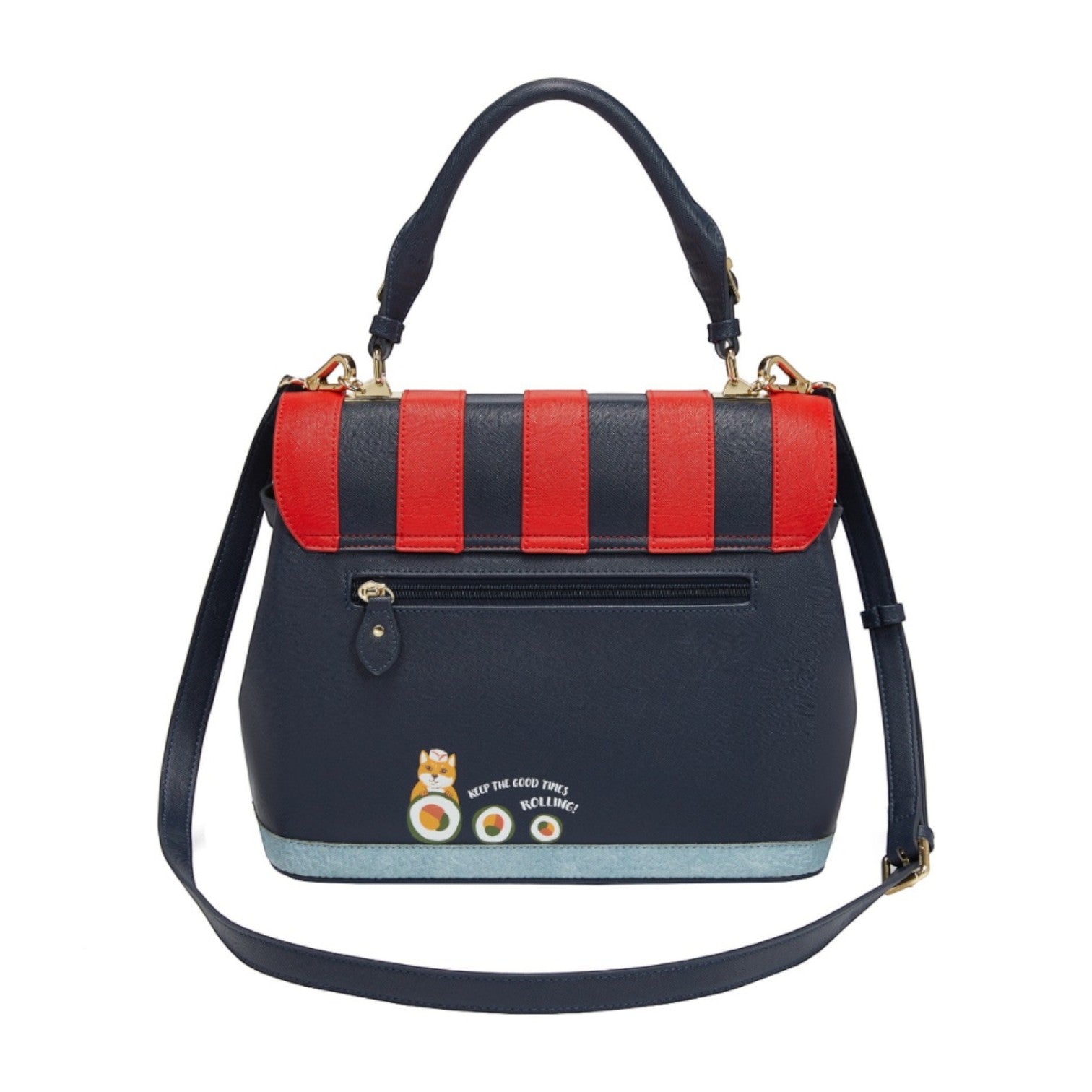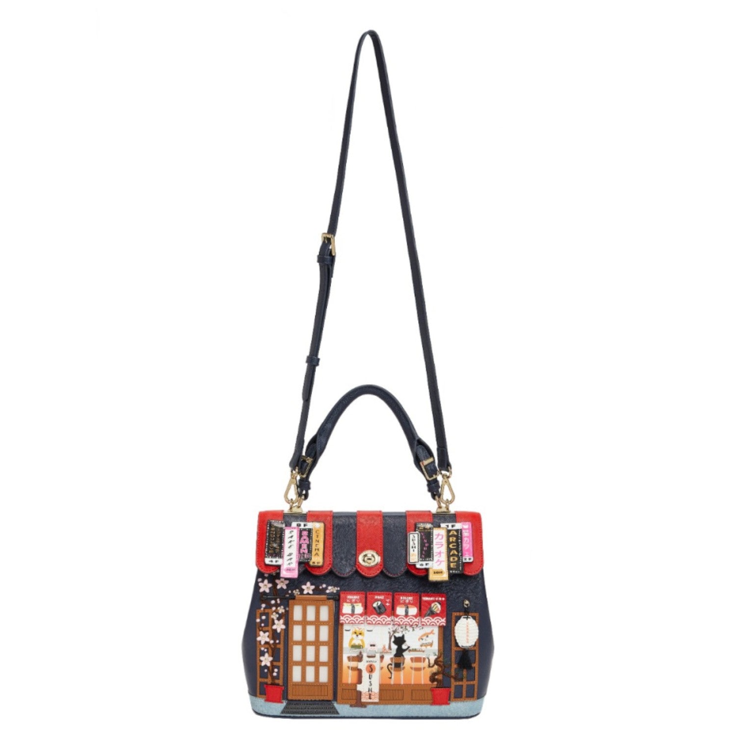 Un bolso que te enamorará nada más tenerlo, está repleto de detalles combinando tonos azul oscuro y naranja, es el bolso perfecto para los amantes de la cultura japonesa, viene con detalles en relieve y bordados que lo hacen único, tiene apertura con cierre semi rígido con broche y cremallera, además de cinta regulable.