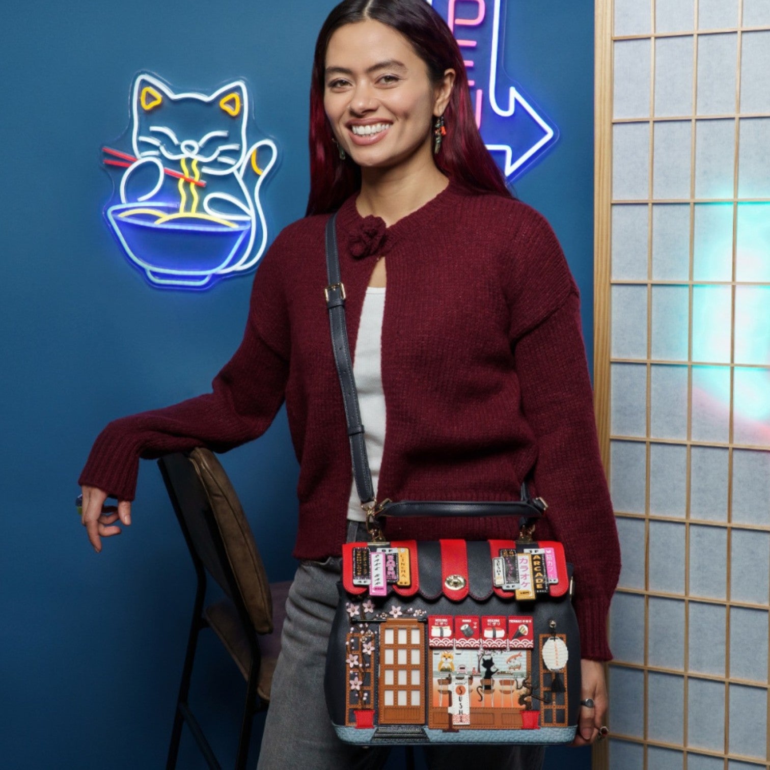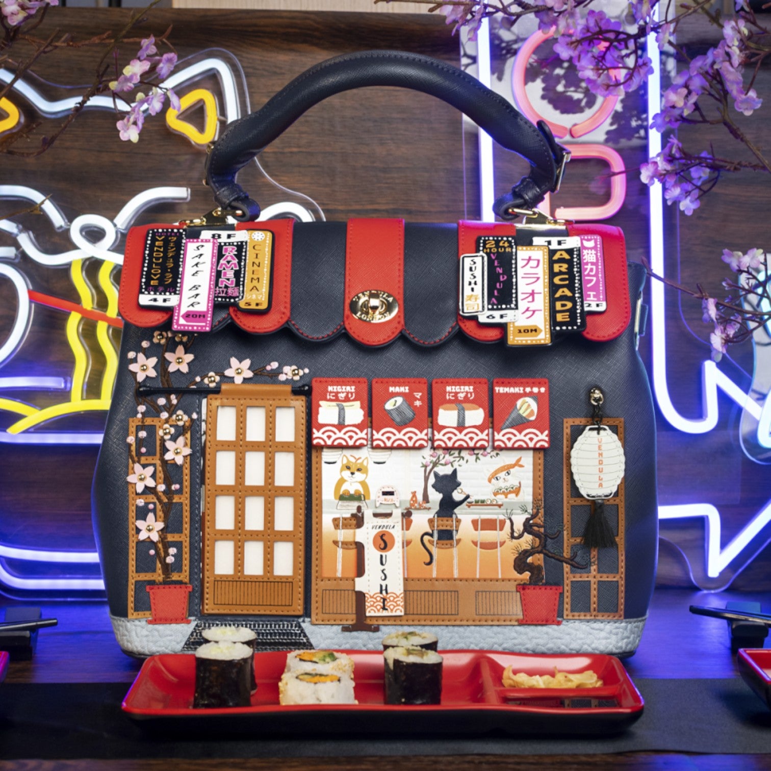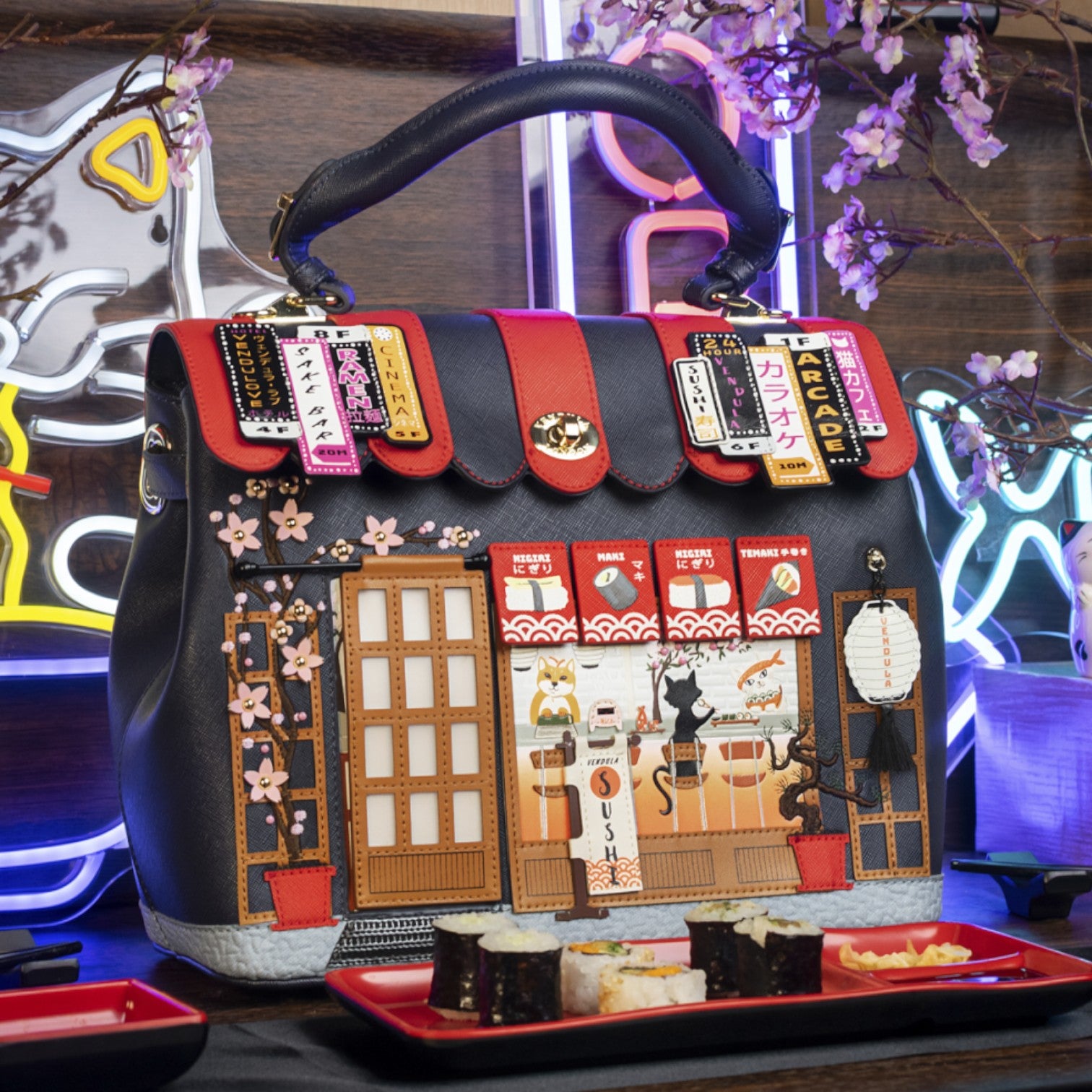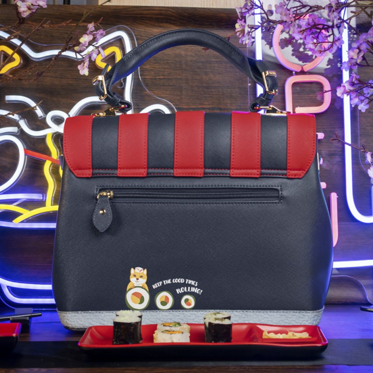 Un bolso que te enamorará nada más tenerlo, está repleto de detalles combinando tonos azul oscuro y naranja, es el bolso perfecto para los amantes de la cultura japonesa, viene con detalles en relieve y bordados que lo hacen único, tiene apertura con cierre semi rígido con broche y cremallera, además de cinta regulable.