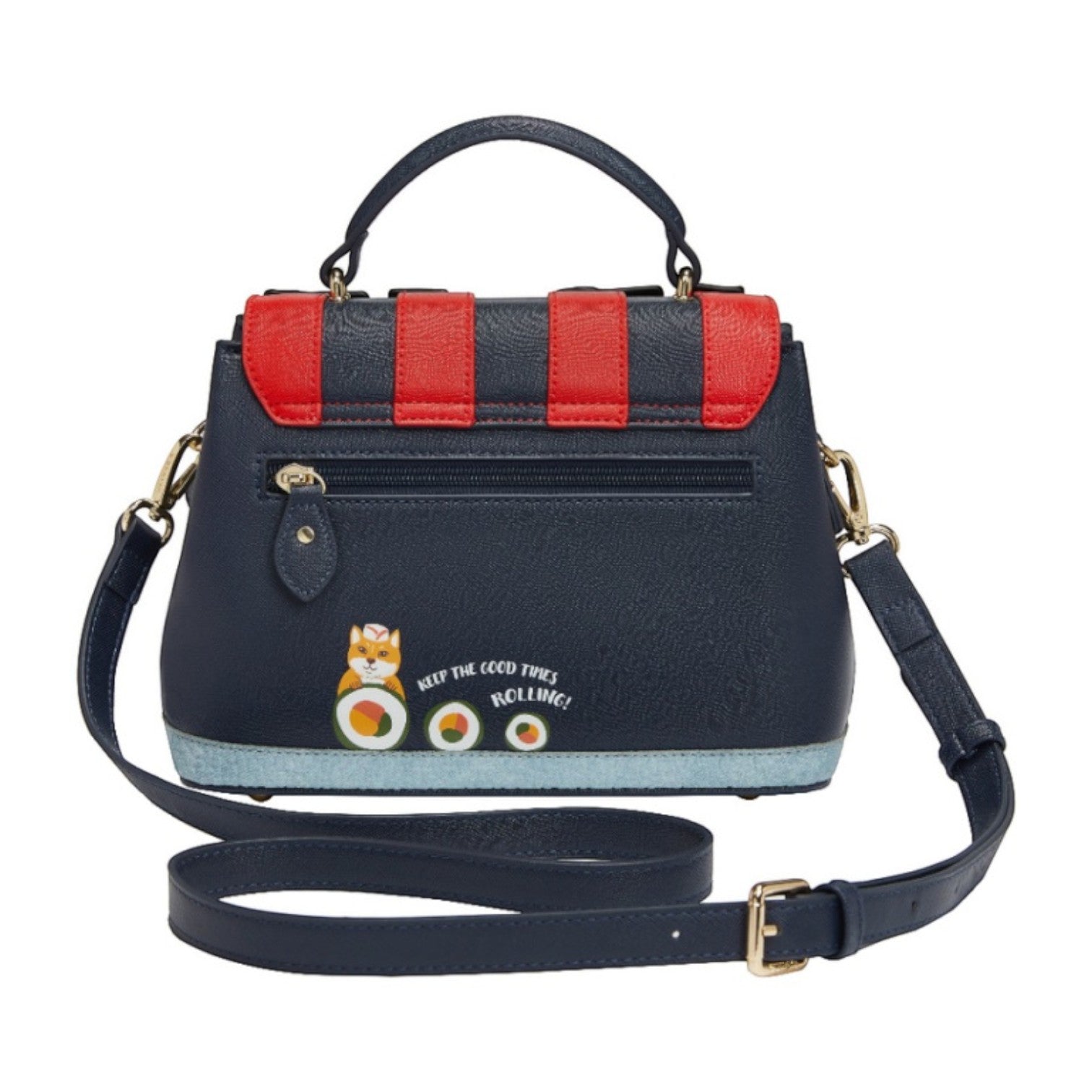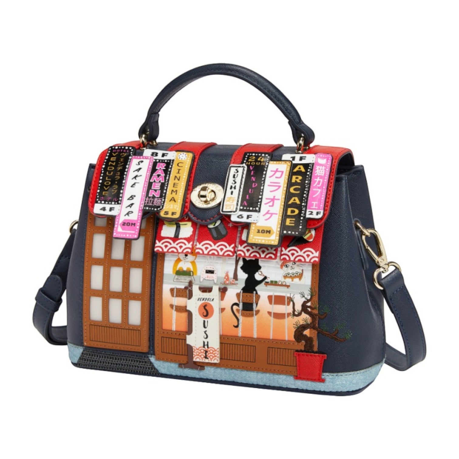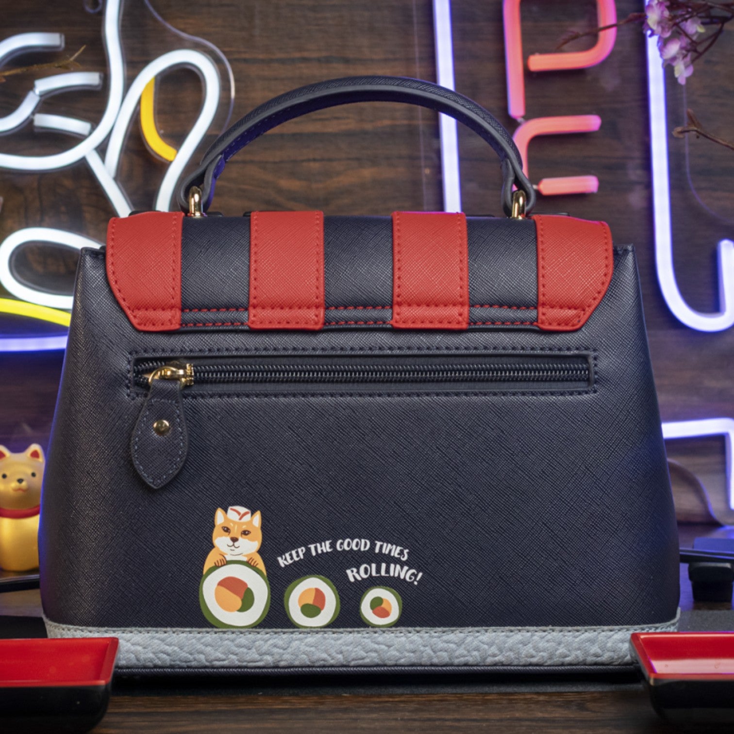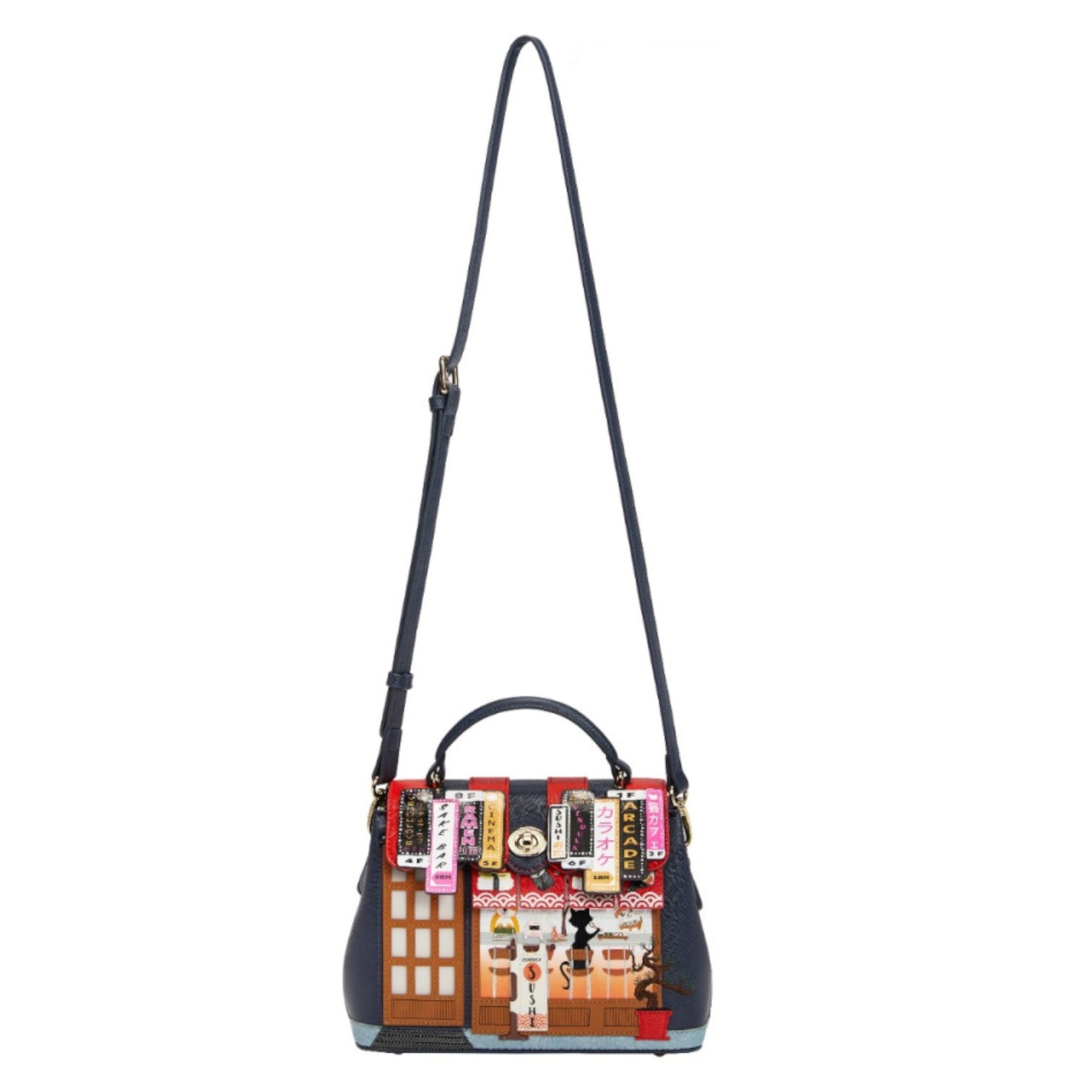 Un bolso que te enamorará nada más tenerlo, está repleto de detalles combinando tonos azul oscuro y naranja, es el bolso perfecto para los amantes de la cultura japonesa, viene con detalles en relieve y bordados que lo hacen único, tiene apertura con cierre semi rígido con broche y cremallera, además de cinta regulable.