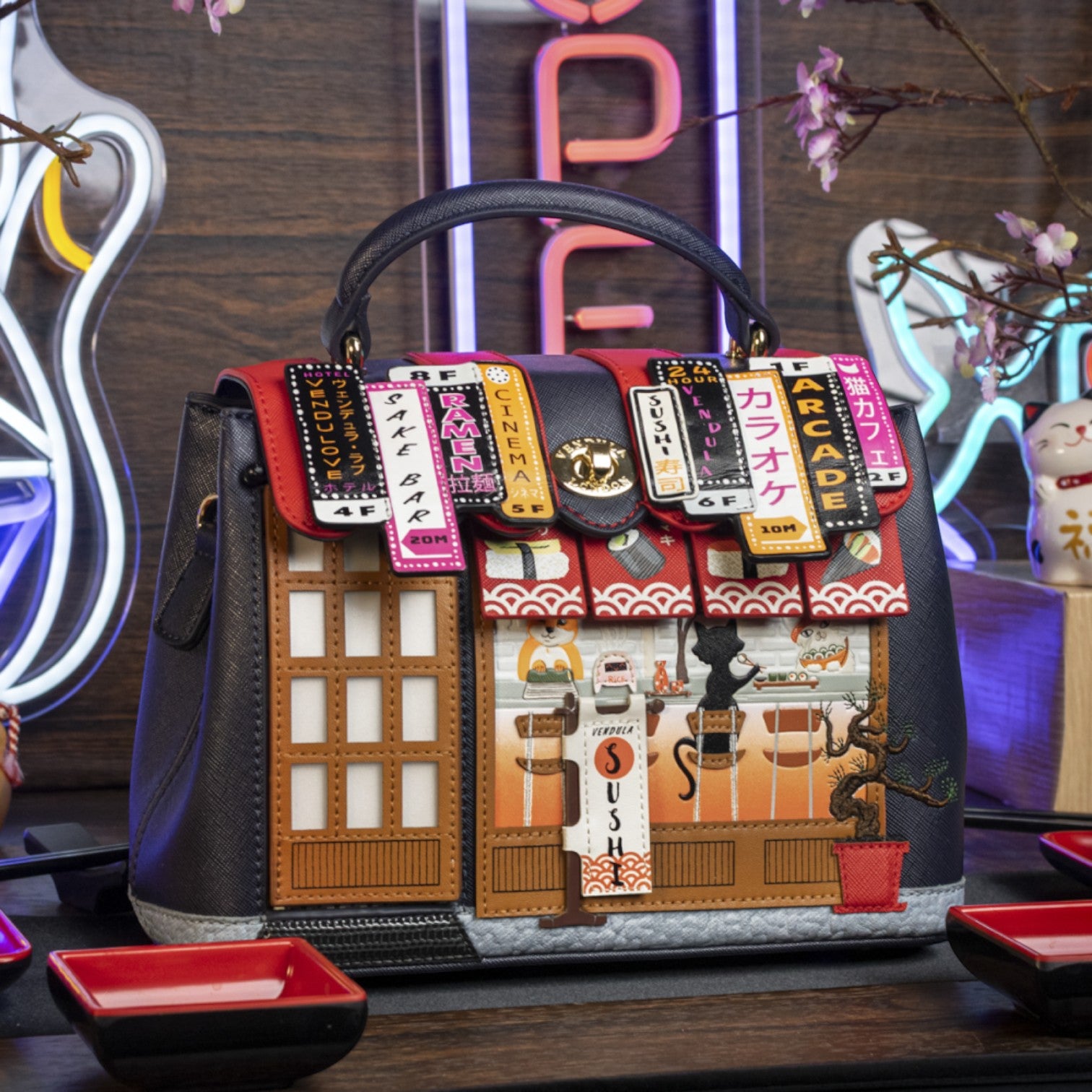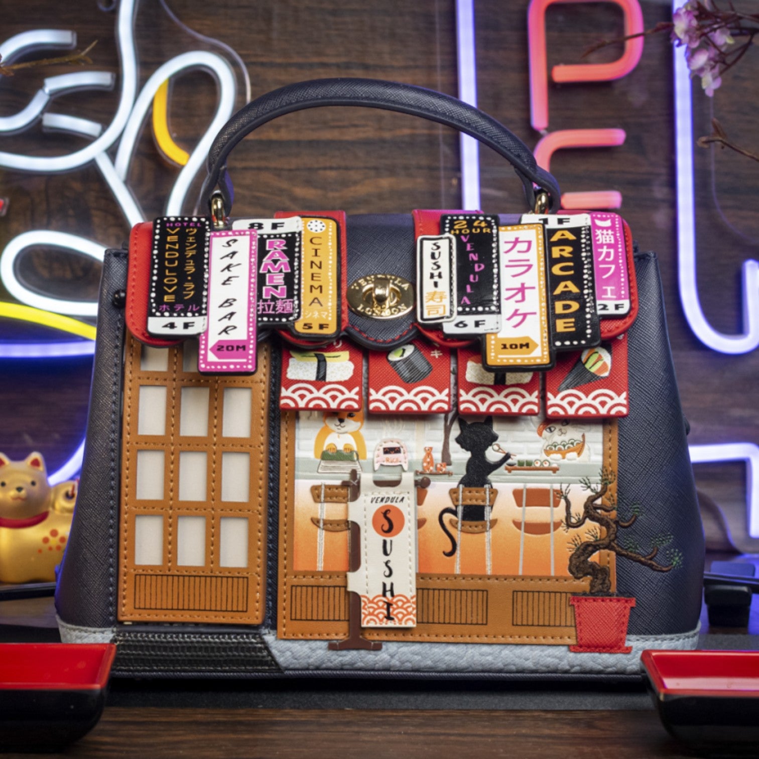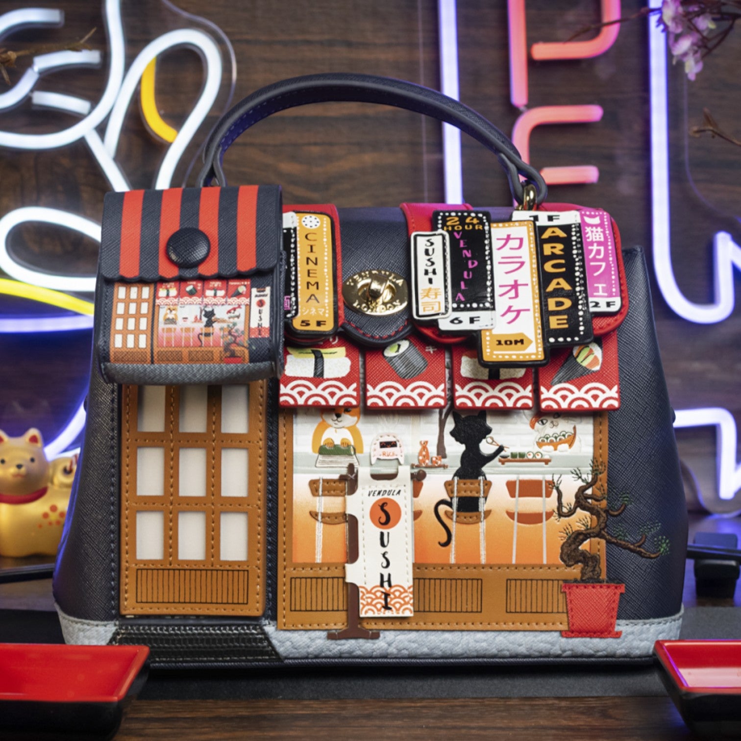 Un bolso que te enamorará nada más tenerlo, está repleto de detalles combinando tonos azul oscuro y naranja, es el bolso perfecto para los amantes de la cultura japonesa, viene con detalles en relieve y bordados que lo hacen único, tiene apertura con cierre semi rígido con broche y cremallera, además de cinta regulable.