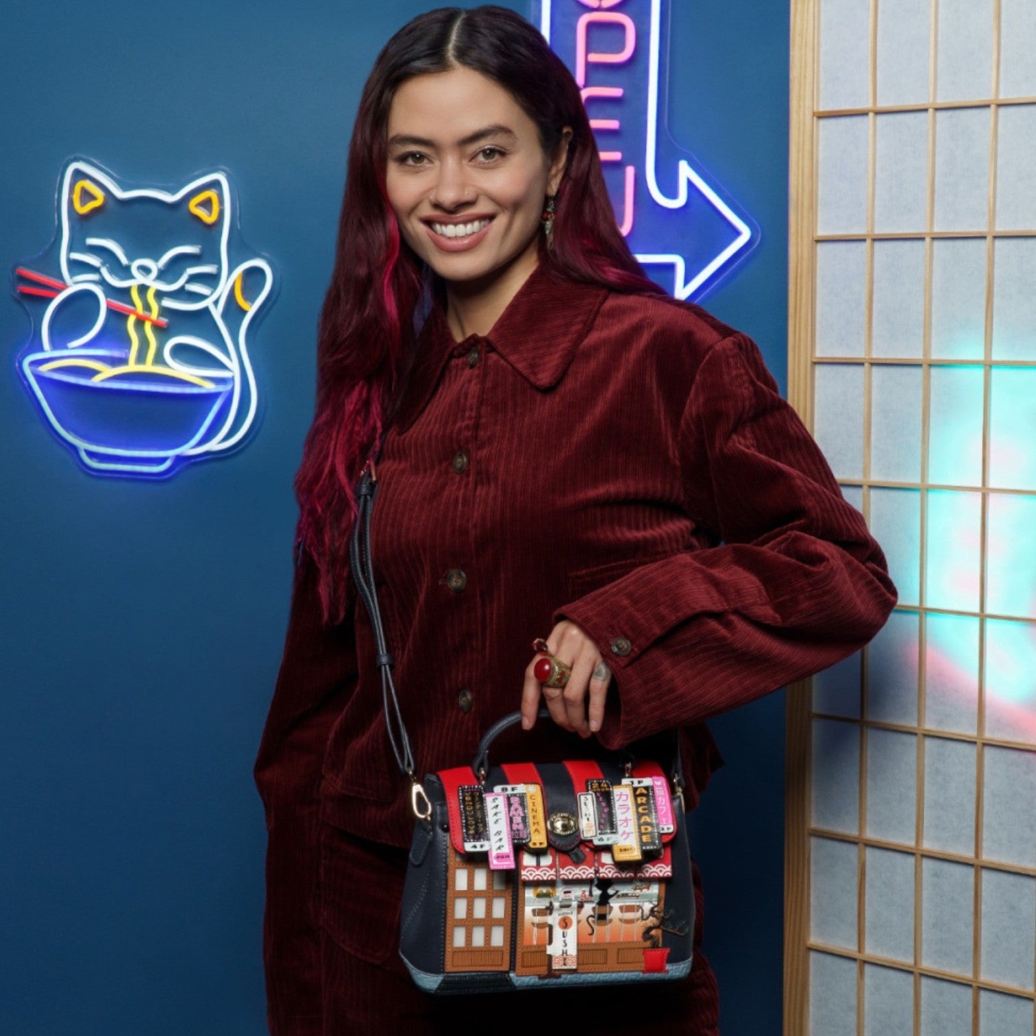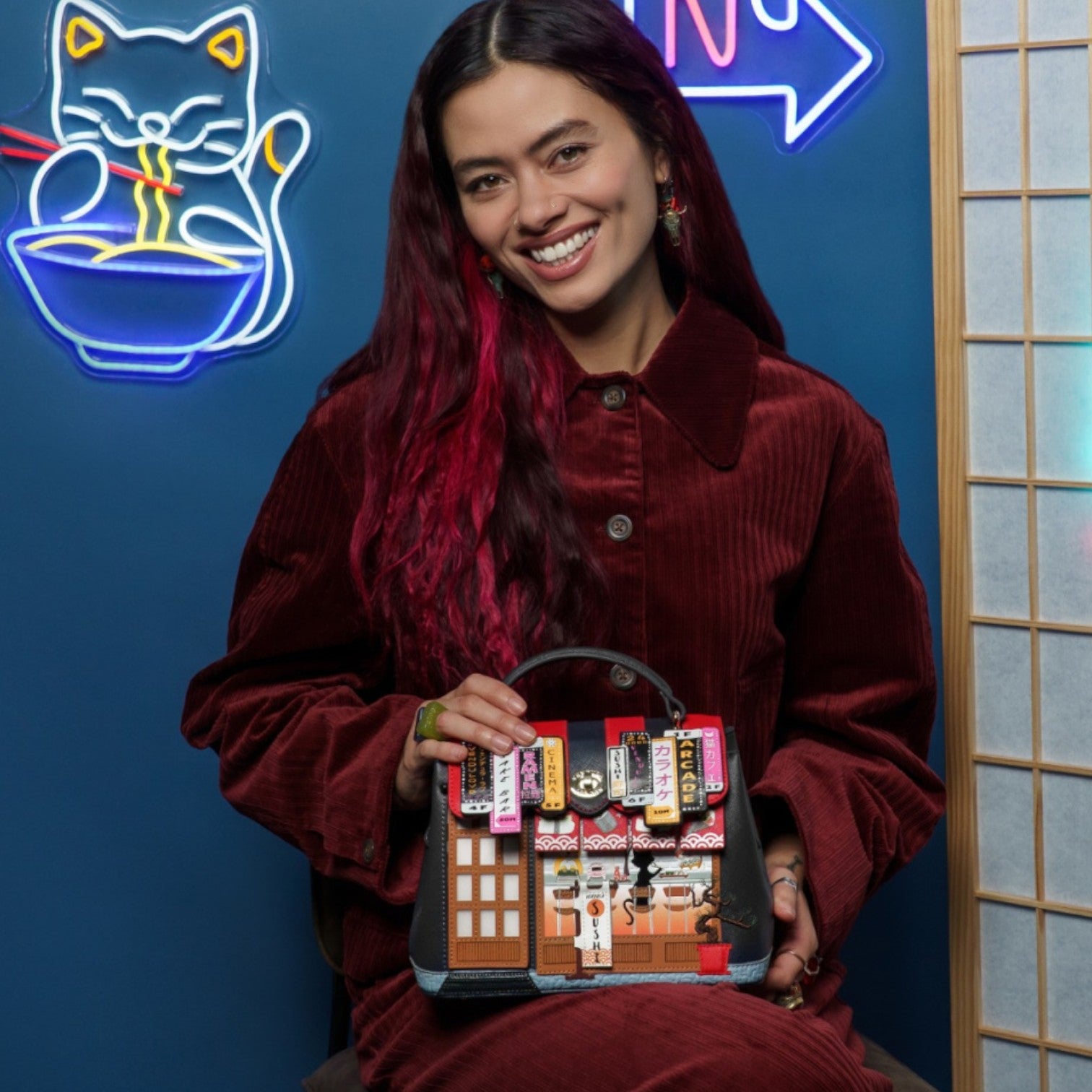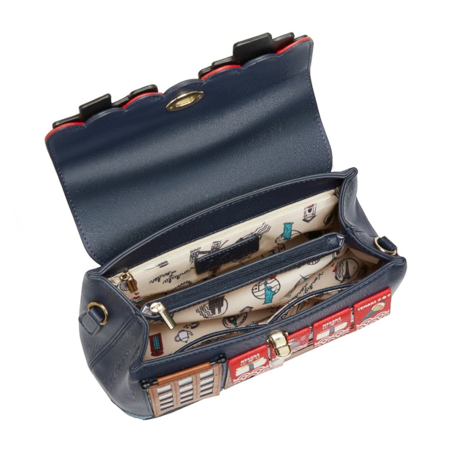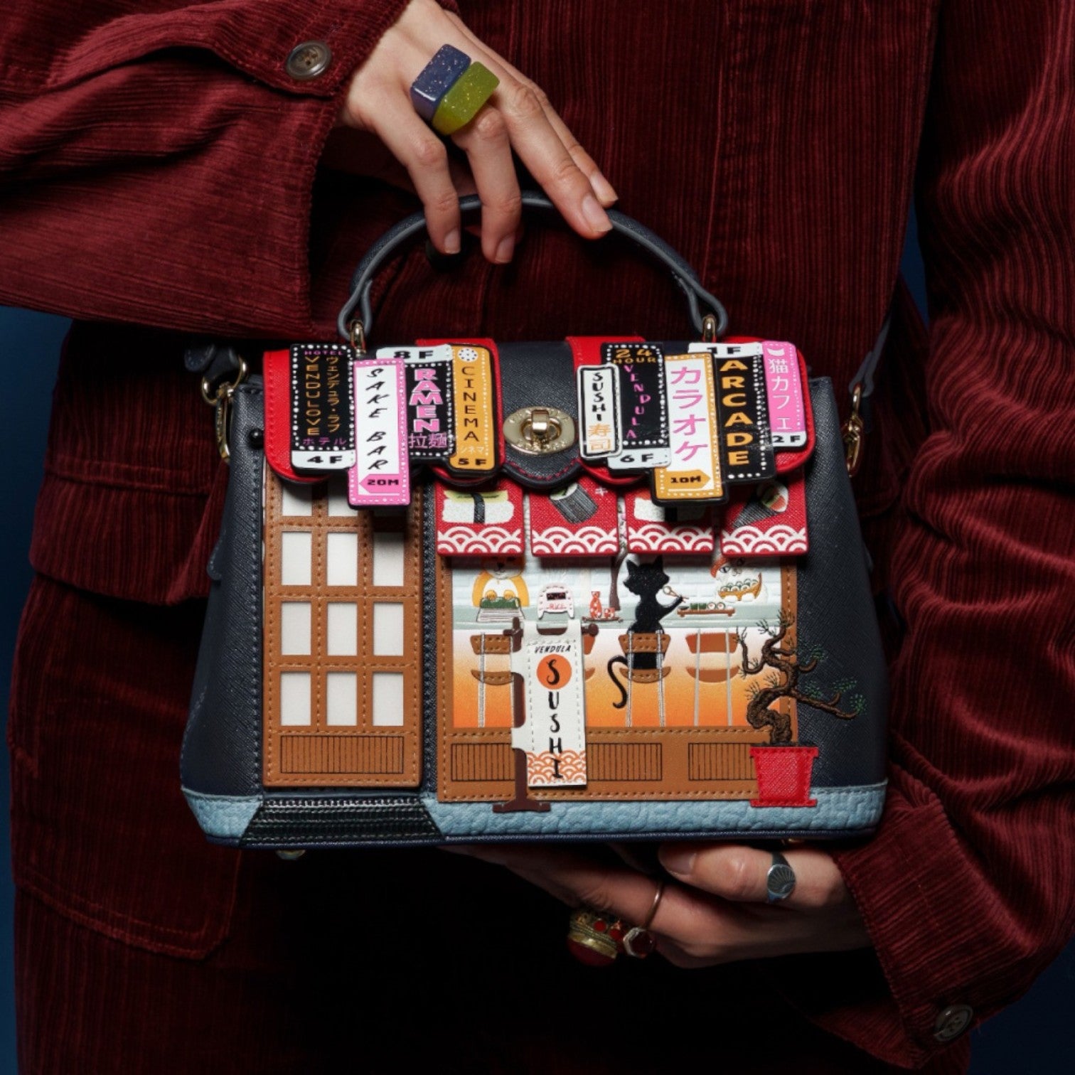 Un bolso que te enamorará nada más tenerlo, está repleto de detalles combinando tonos azul oscuro y naranja, es el bolso perfecto para los amantes de la cultura japonesa, viene con detalles en relieve y bordados que lo hacen único, tiene apertura con cierre semi rígido con broche y cremallera, además de cinta regulable.