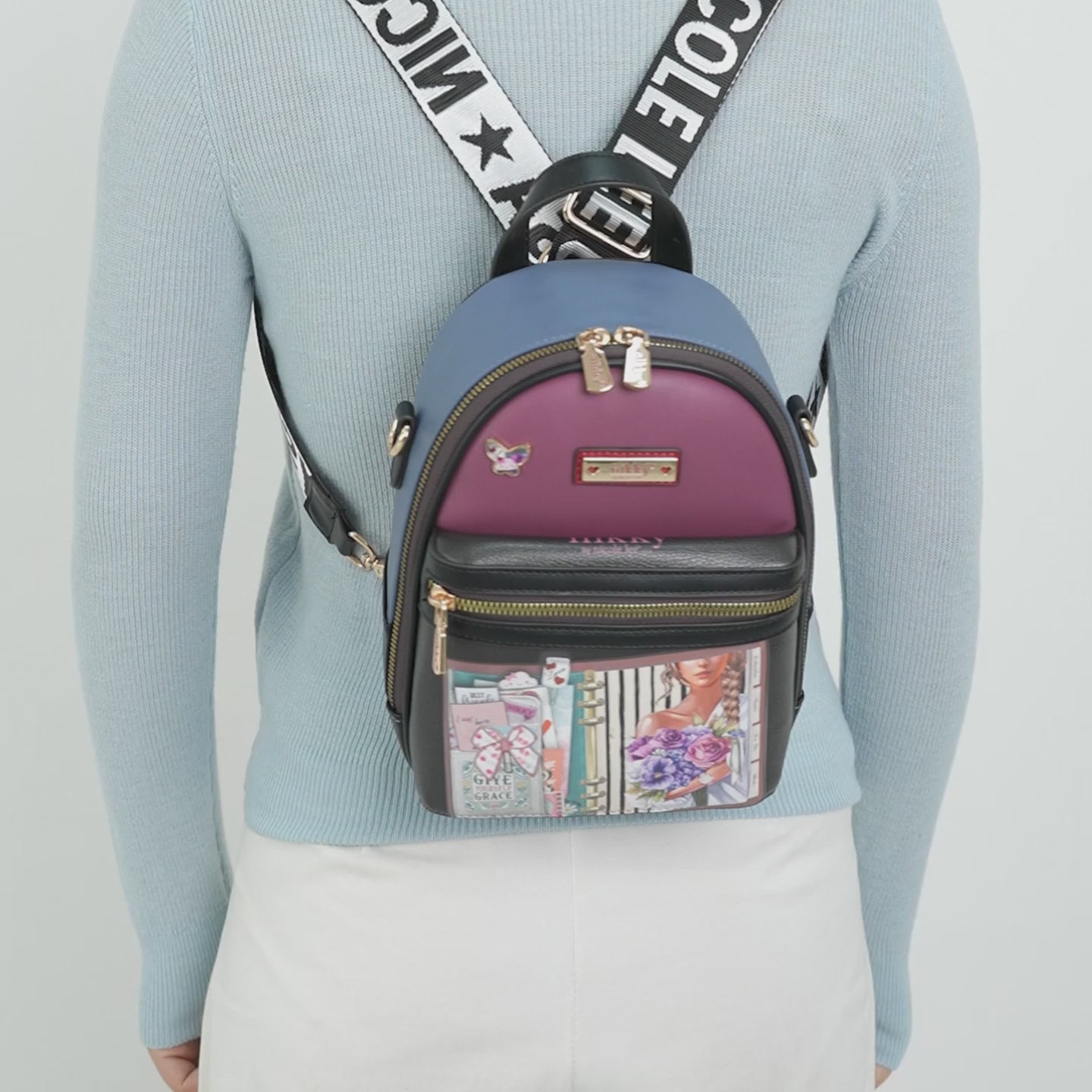 La Mochila Convertible Asa Nikky Nostalgia es el accesorio perfecto para quienes buscan funcionalidad y estilo en un mismo diseño. Su tamaño compacto la convierte en la aliada ideal para el día a día, y gracias a su cinta regulable puede usarse tanto como mochila clásica o en versión bandolera. El diseño artístico característico de la colección y los herrajes dorados aportan un toque sofisticado y único.