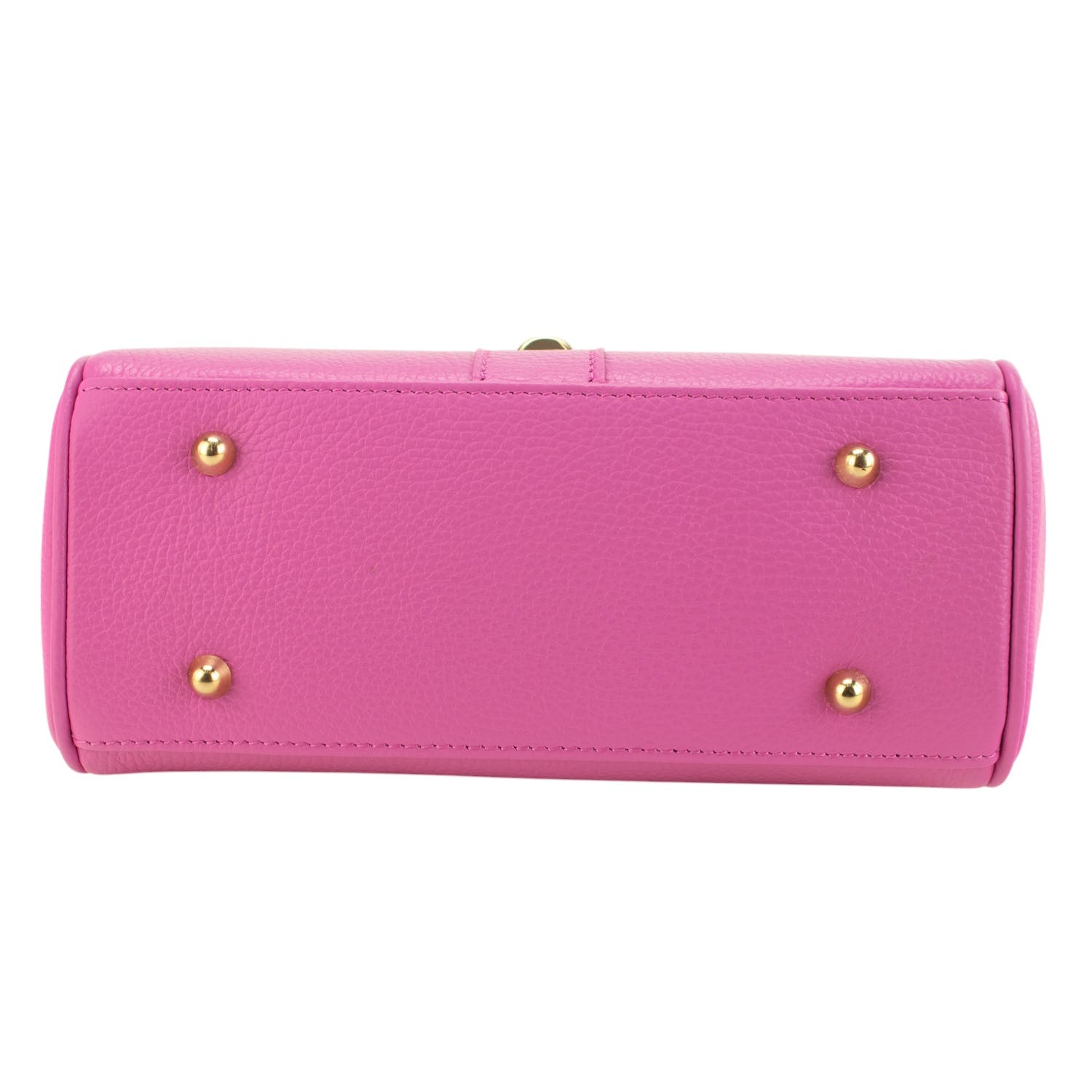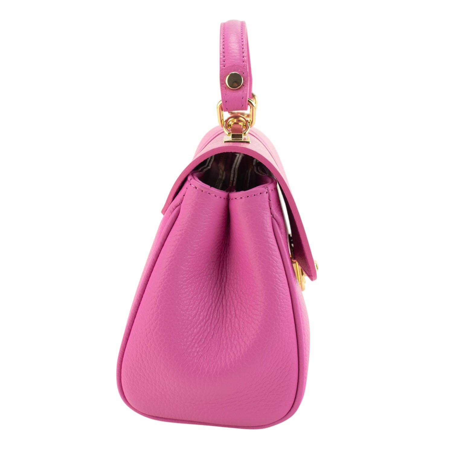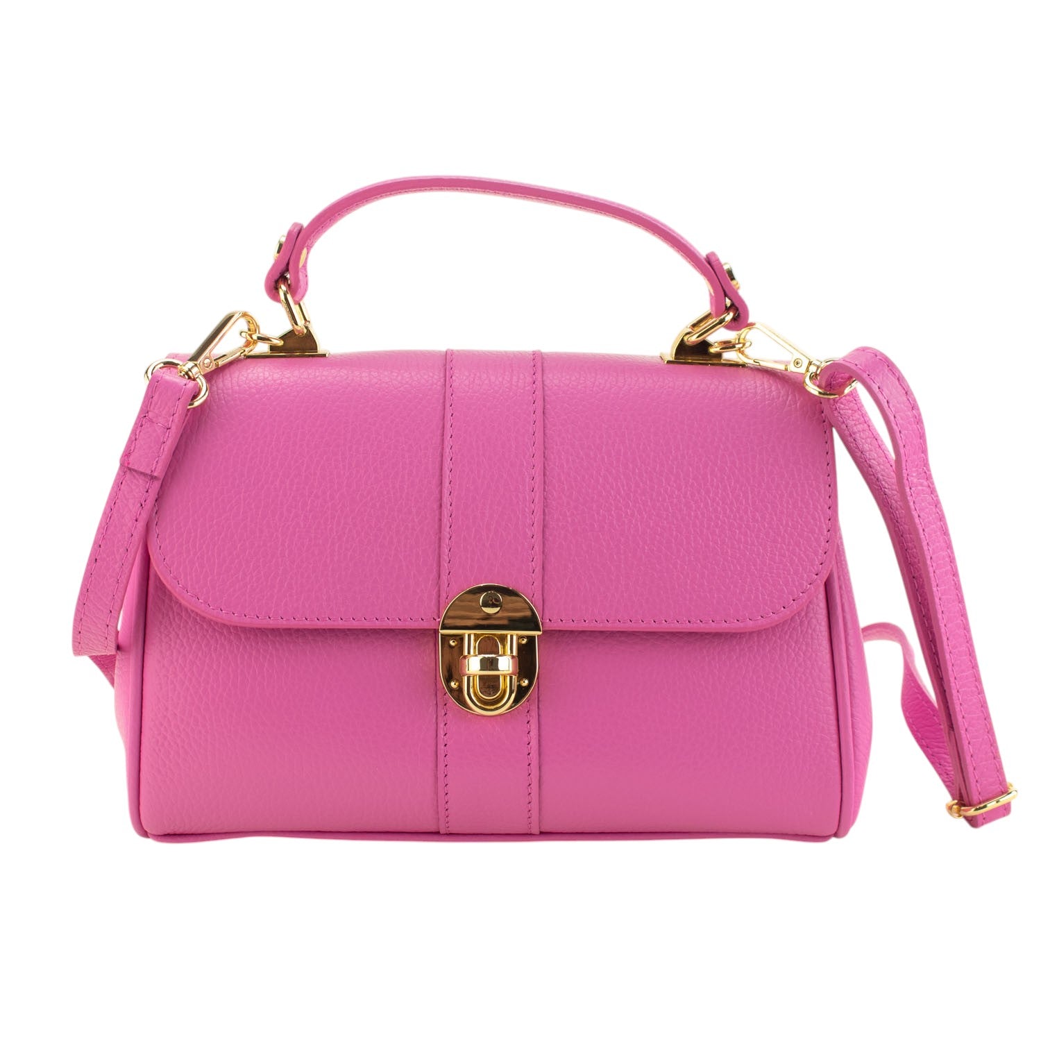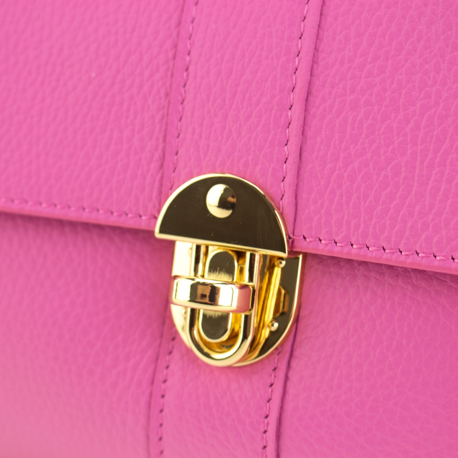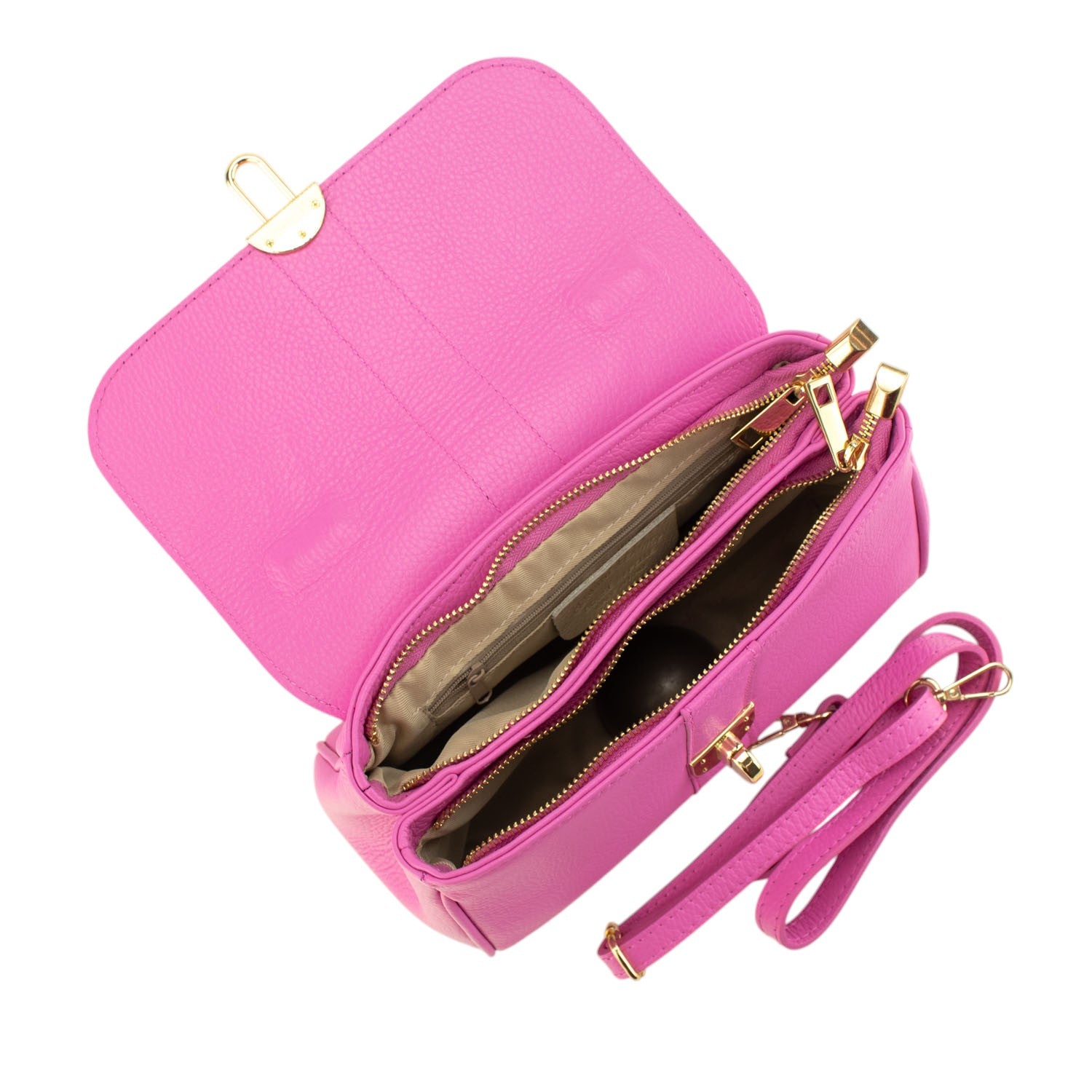 Un bolso muy original para lucir a diario, realizado en Piel 100% genuina vacuno italiana, este bolso está hecho en Italia con una excelente manufactura y calidad, tiene un cierre de solapa broche metalizado en tono dorado muy original, con doble compartimento interior amplio con cierre de cremallera. Dispone de asa mano y cinta de bandolera ajustable.