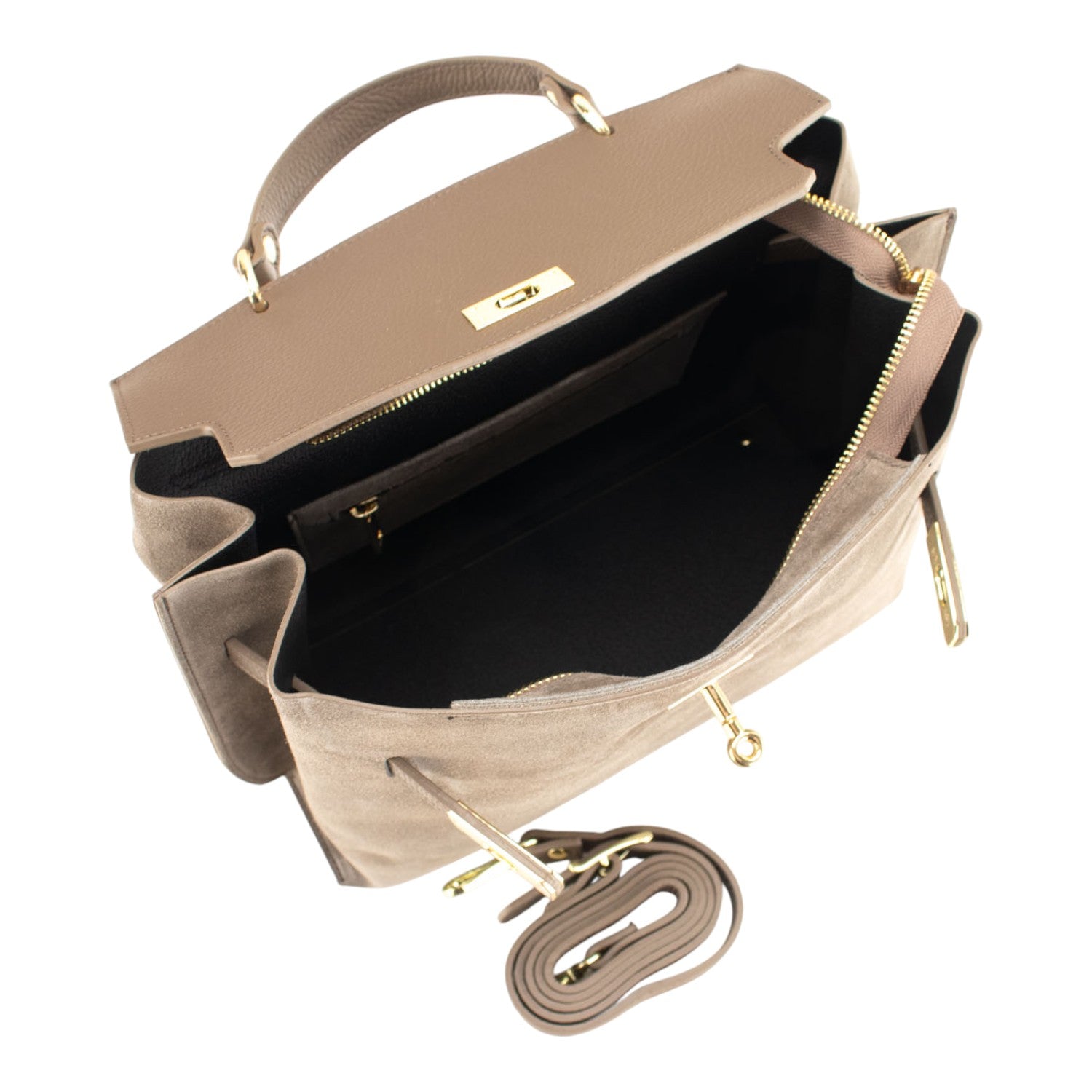 Elegante y sofisticado, el Bolso en Piel Pregato Nobile Ante es una pieza atemporal pensada para acompañarte tanto en tu día a día como en ocasiones más especiales. Su cuidada combinación de piel vacuno lisa con acabado ante aporta un toque distinguido y actual, mientras que su estructura definida garantiza comodidad y organización.