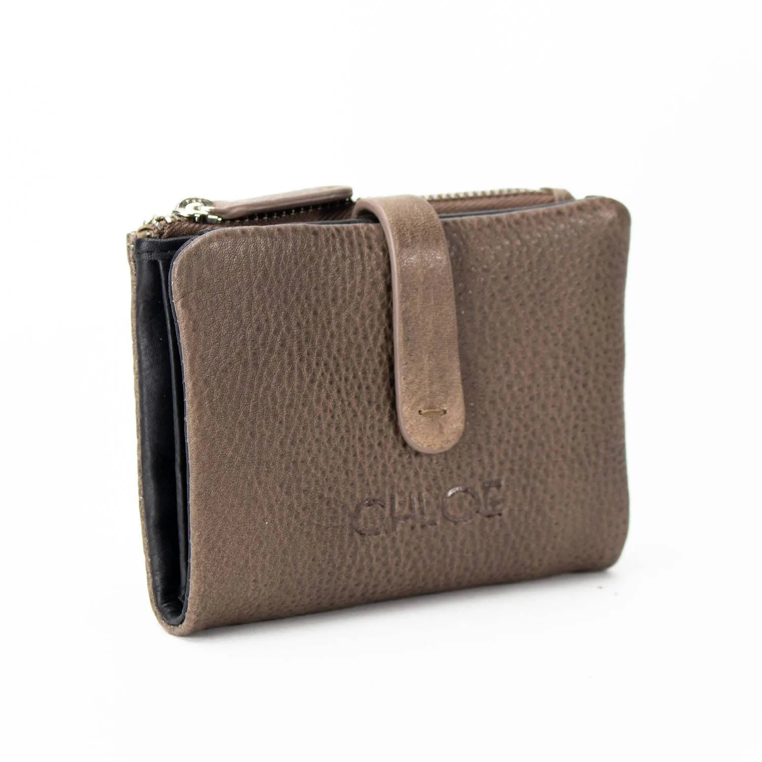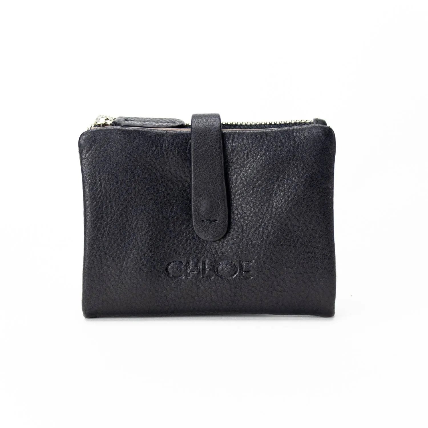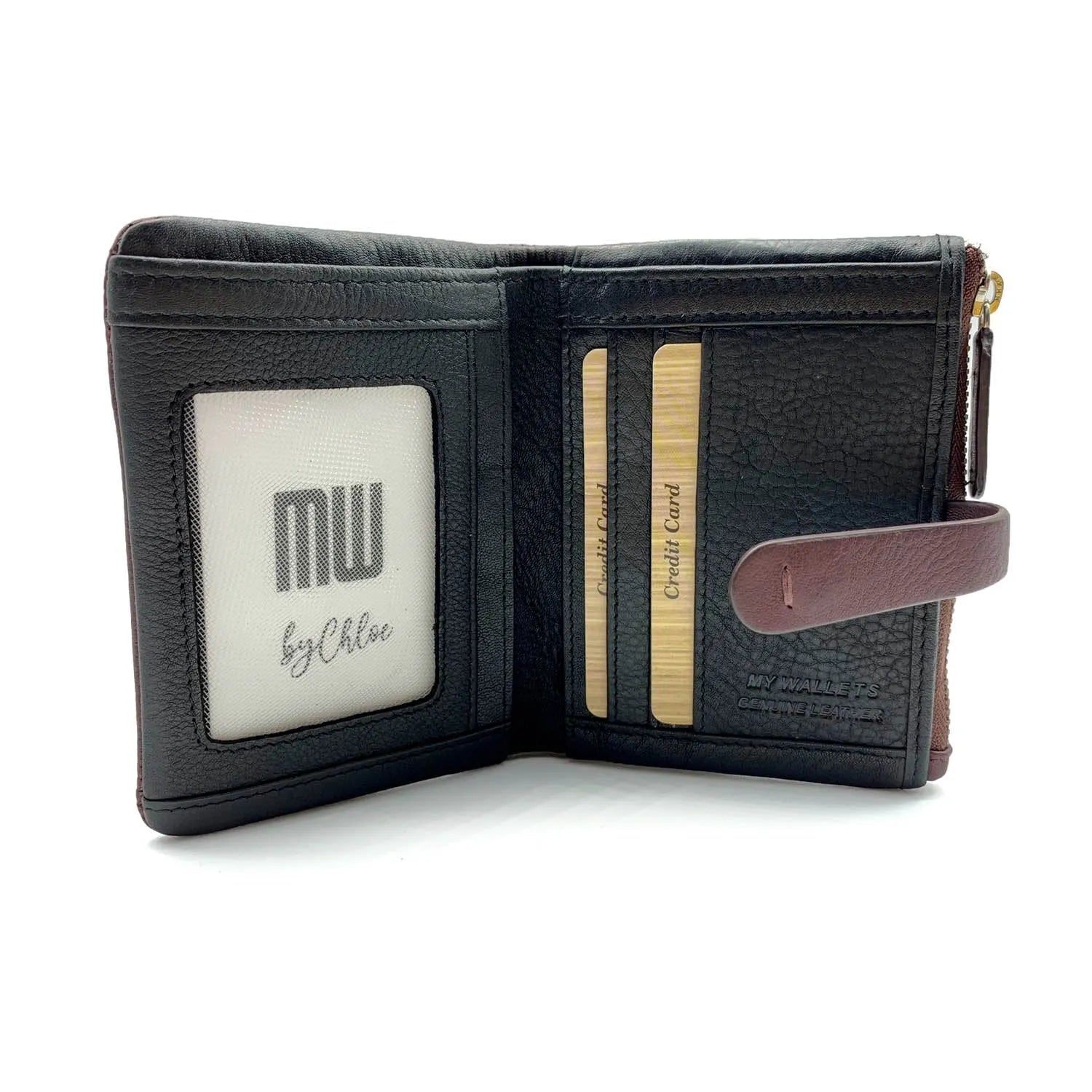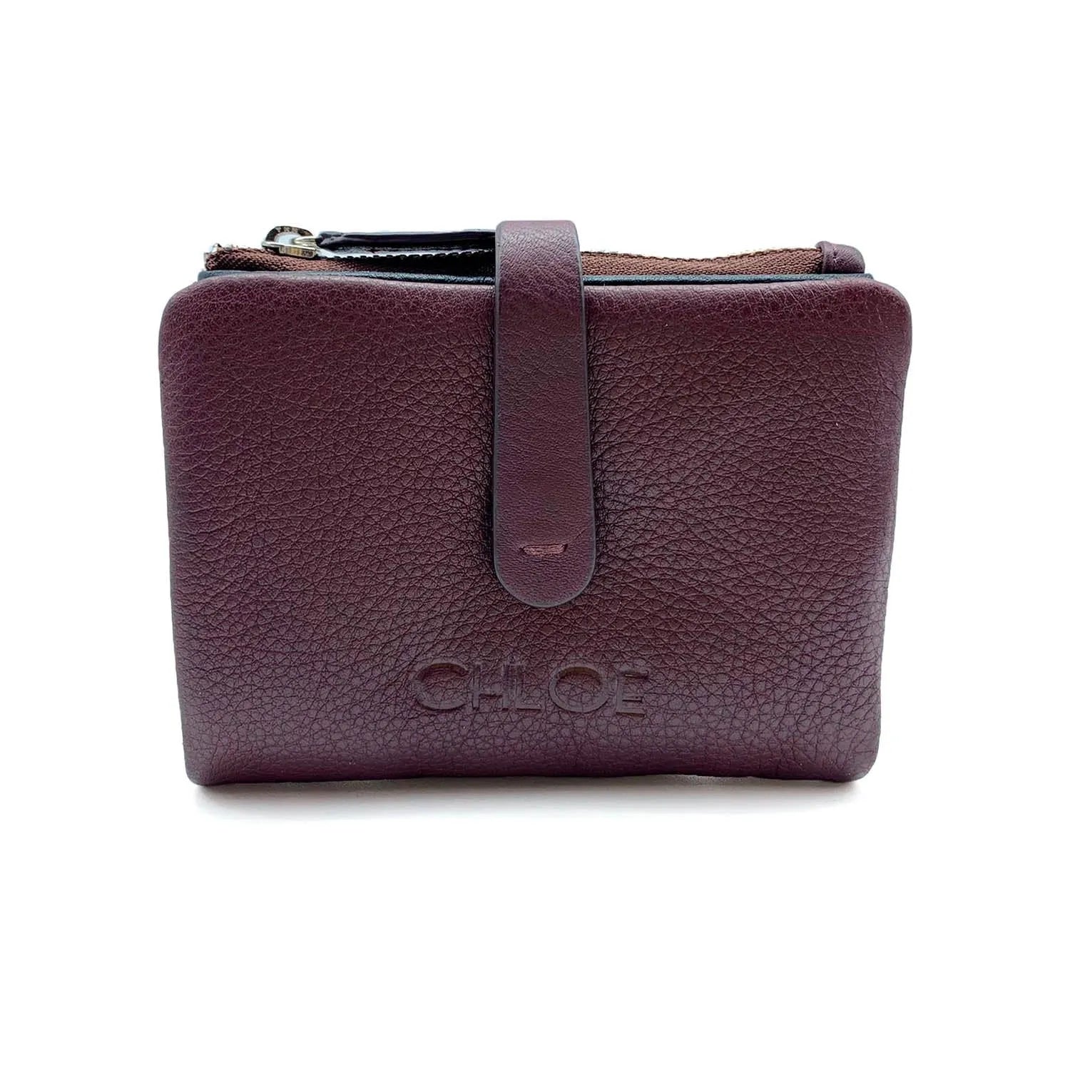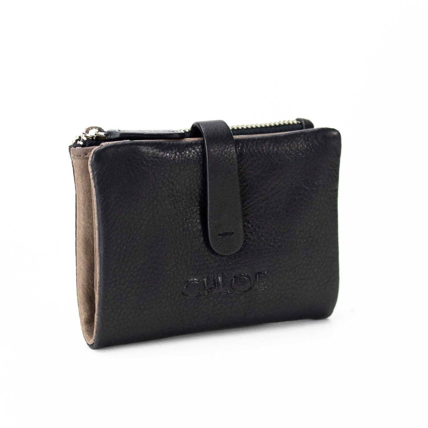 Carteira pequena ByChloe feminina com fecho de correr com acabamento soft touch com logótipo gravado no couro, uma carteira muito compacta com espaço para 3 cartões, janela transparente para cartão de identificação ou foto, bolsos interiores, espaço para notas juntamente com bolso com fecho de correr adicional e bolso para moedas separado com fecho de correr