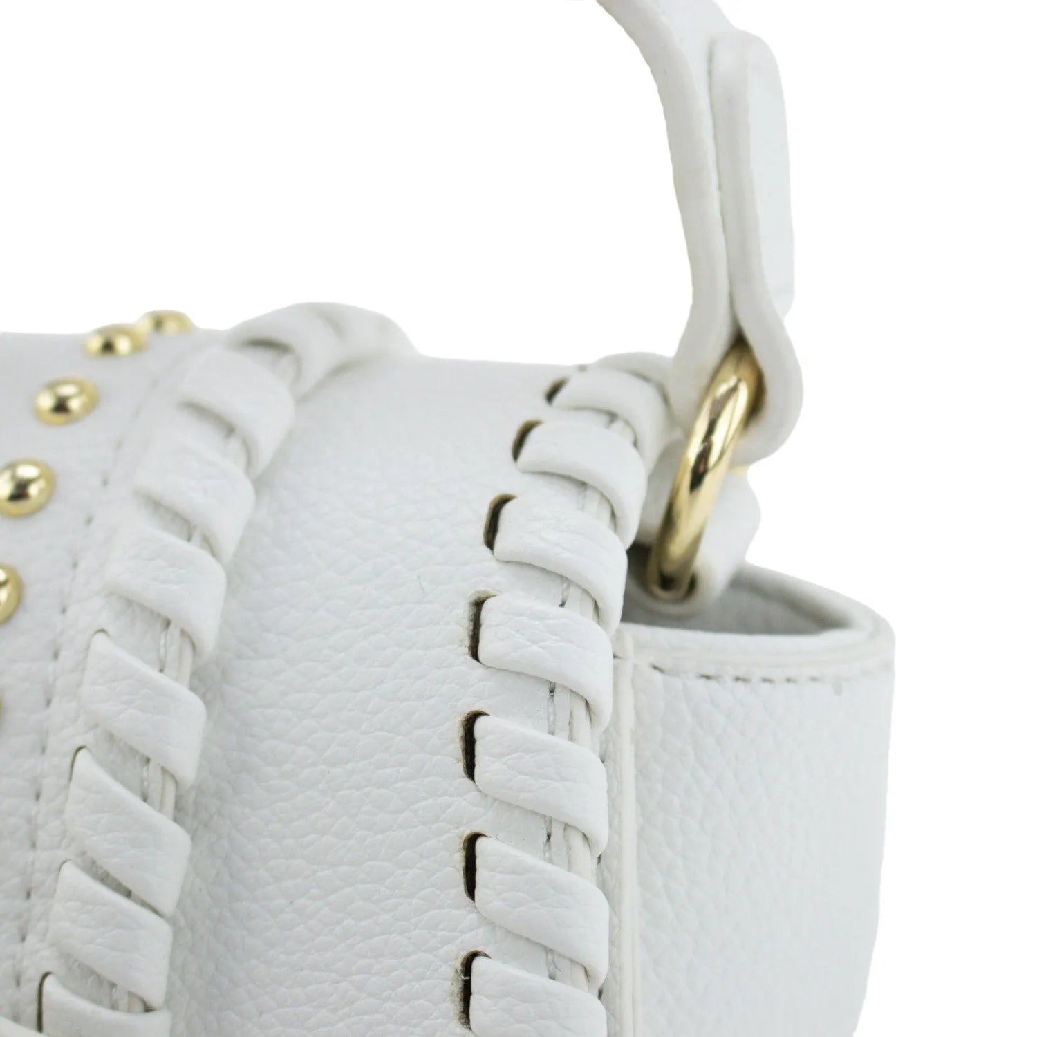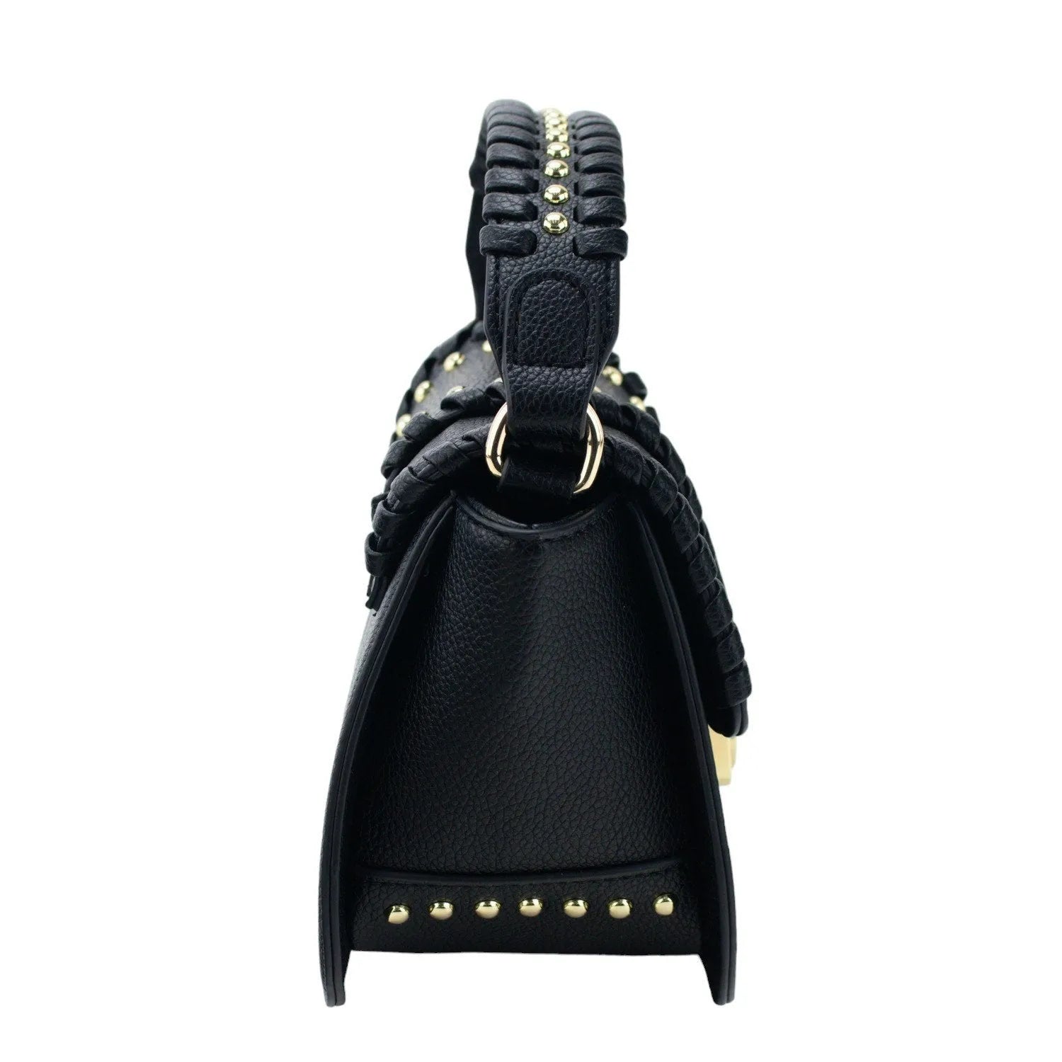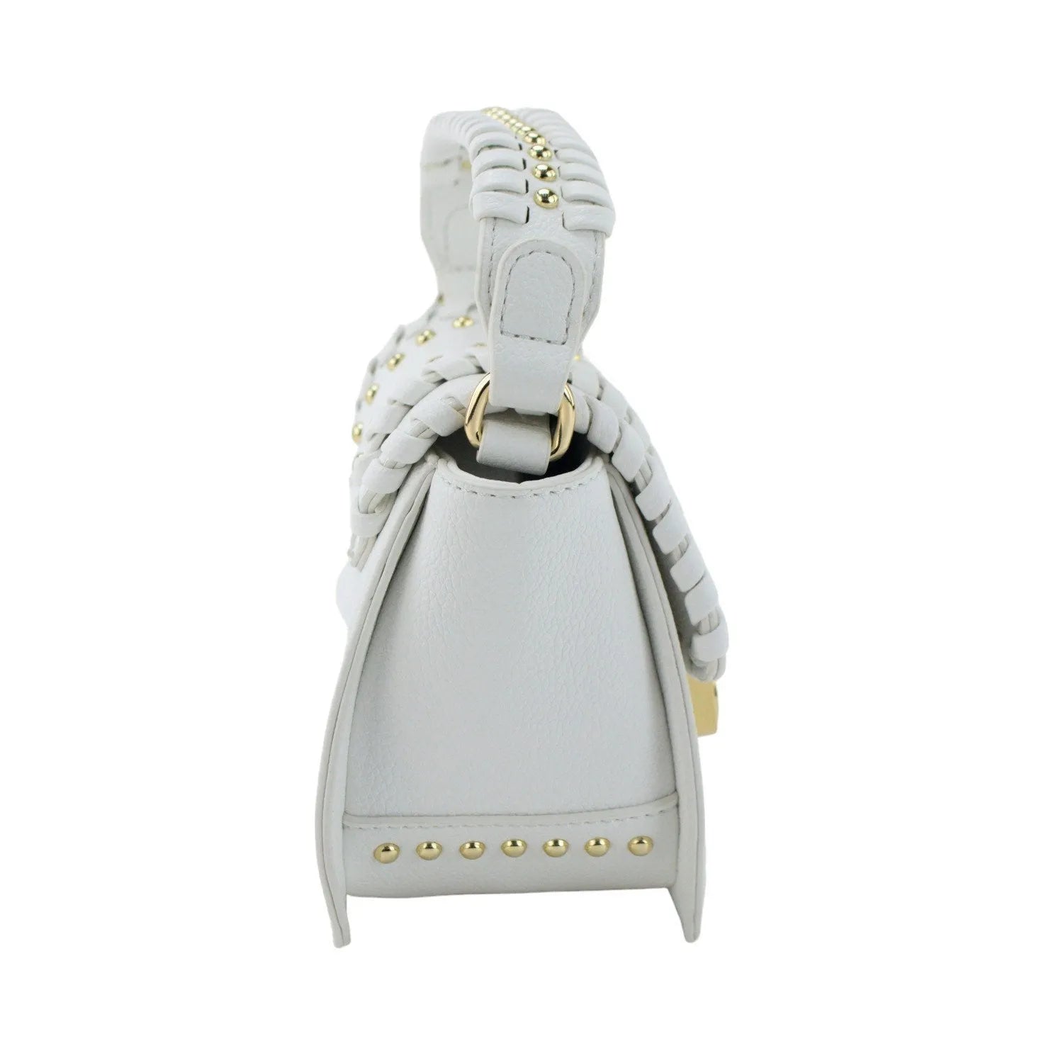 Uma espetacular bolsa com alça e compartimento interior com fecho de aba e fecho de correr. Incorpora tachas protetoras no chão em tom dourado. Seu exterior é um espetáculo de cores que detalha os elementos cravejados e trançados que realçam o design ao mais alto nível.